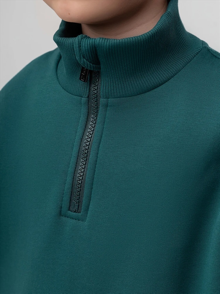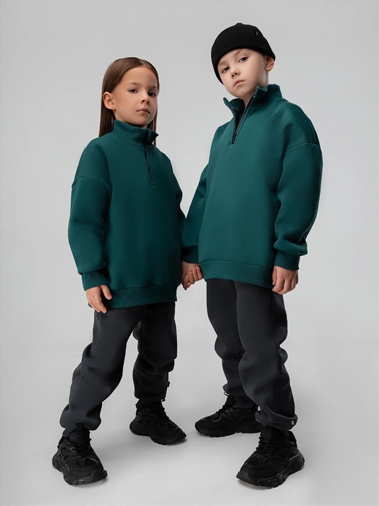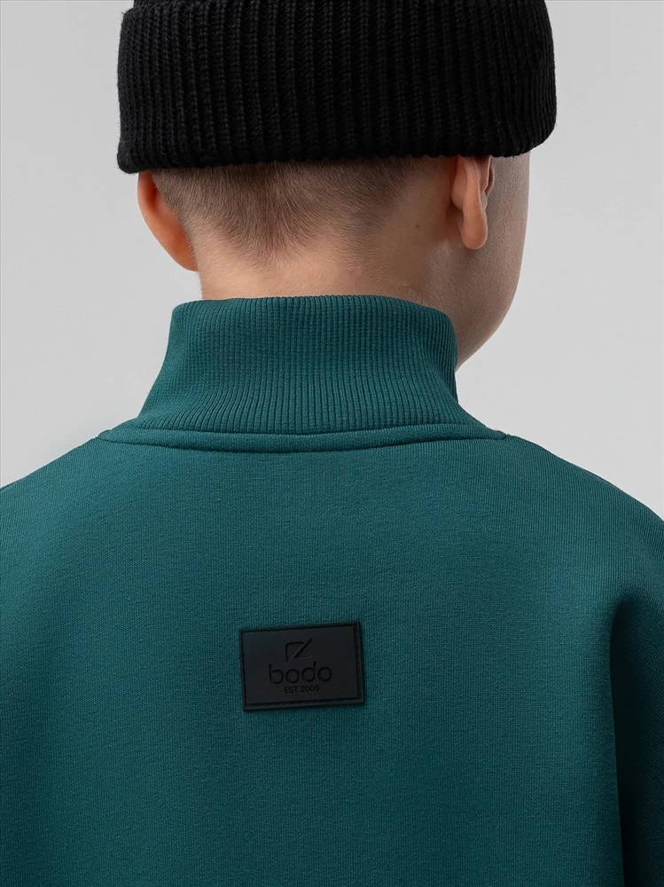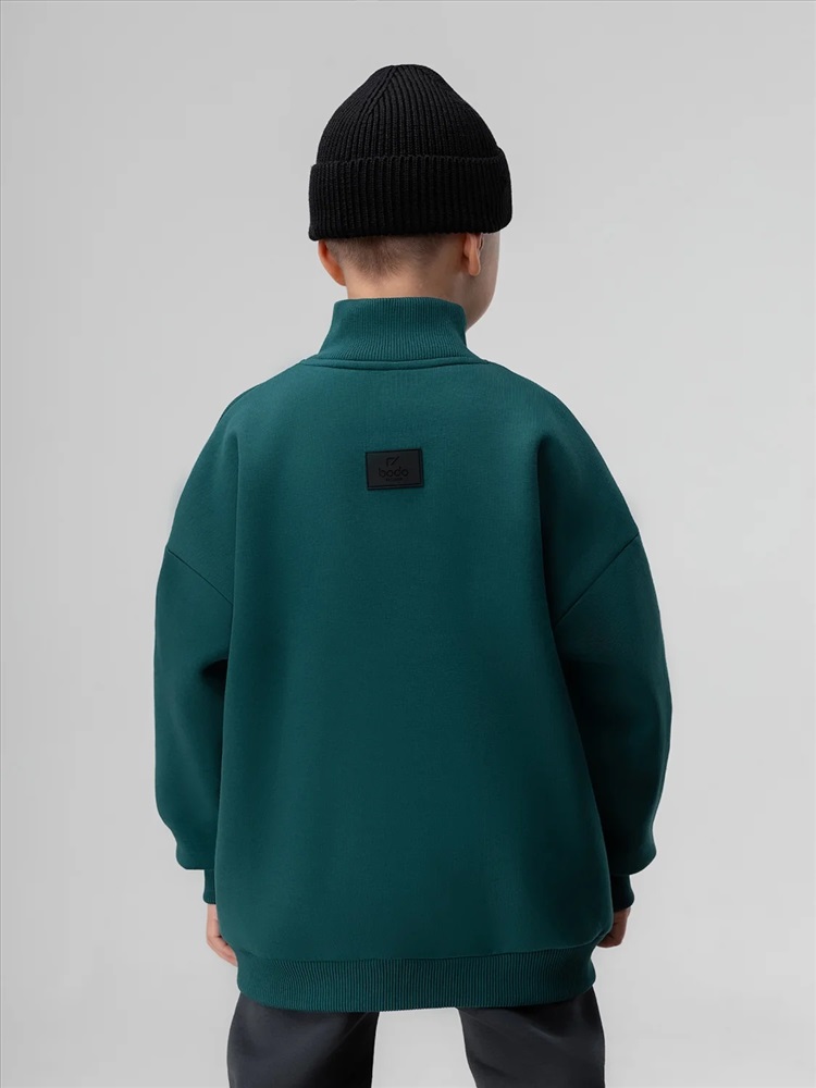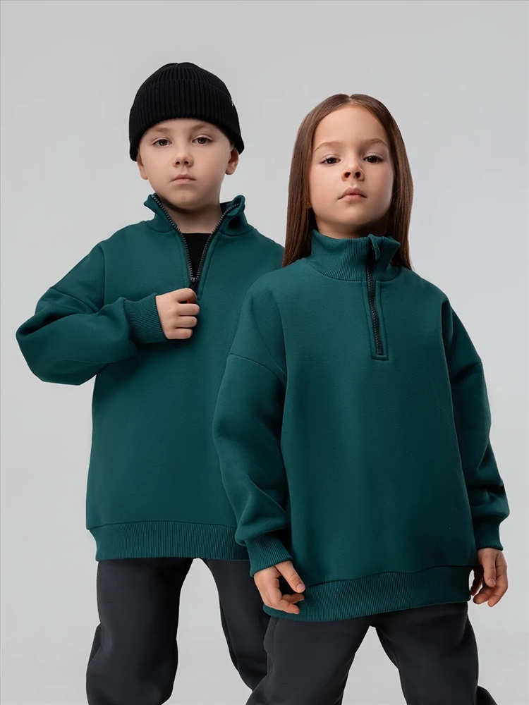 Свободная толстовка со спущенным плечом и длинными рукавами с манжетой. Воротник стойка, застёжка на короткую молнию по центру полочки.
