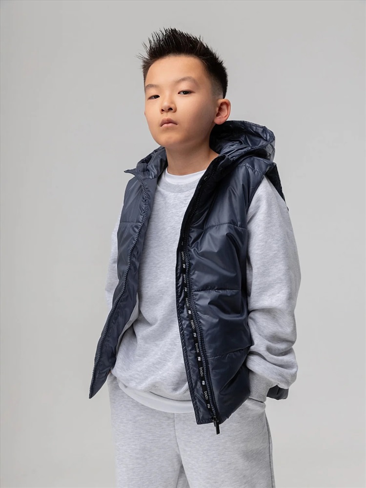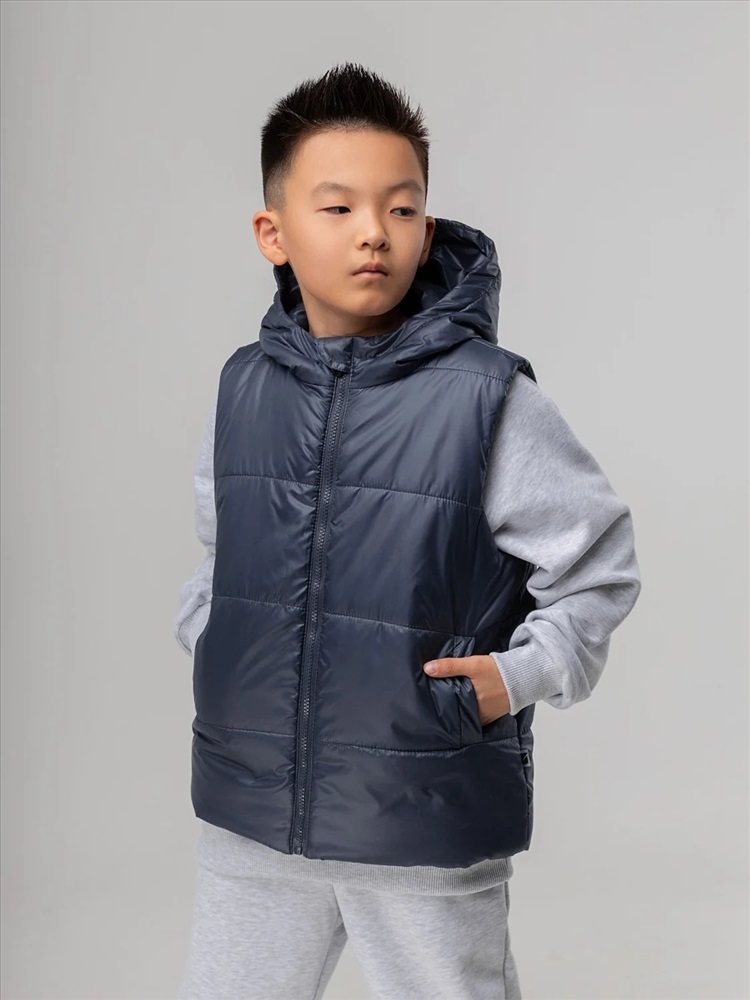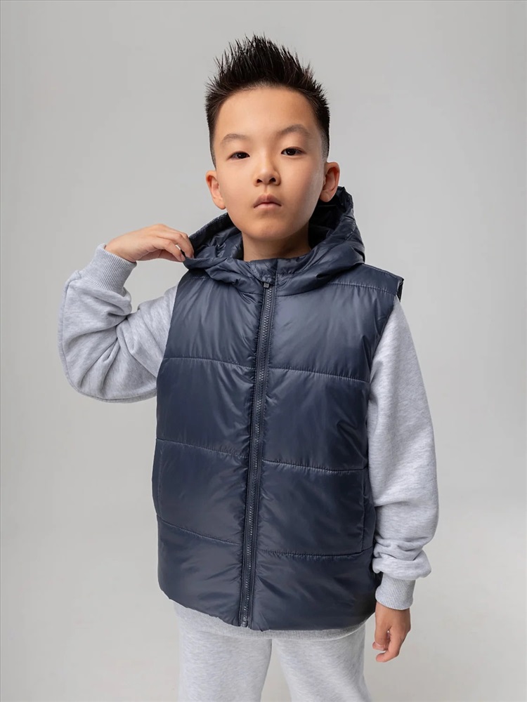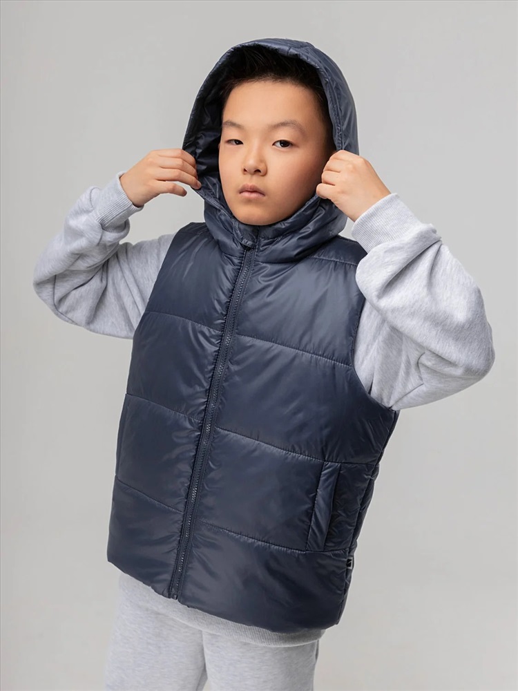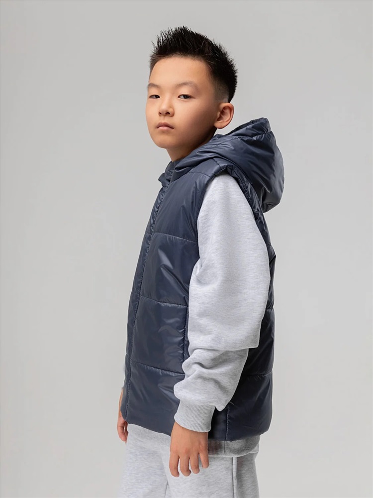 Стильный жилет с капюшоном для детей школьного возраста. Материал жилета FITSYSTEM имеет специальное водонепроницаемое и водоотталкивающее покрытие и пропитку, защищает от дождя, влаги и ветра. Материал верха: Fitsystem Style 100% полиэстер, утеплитель Hetta micro premium S4-K 150 г/кв.м, подкладочный материал кулирная гладь 100% хлопок
