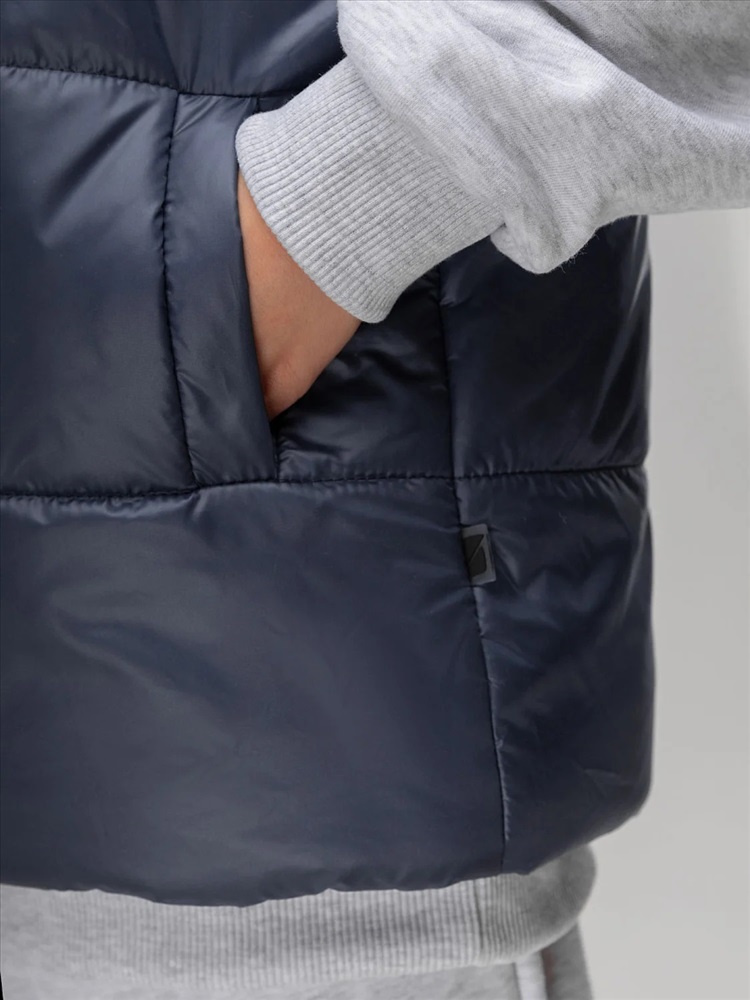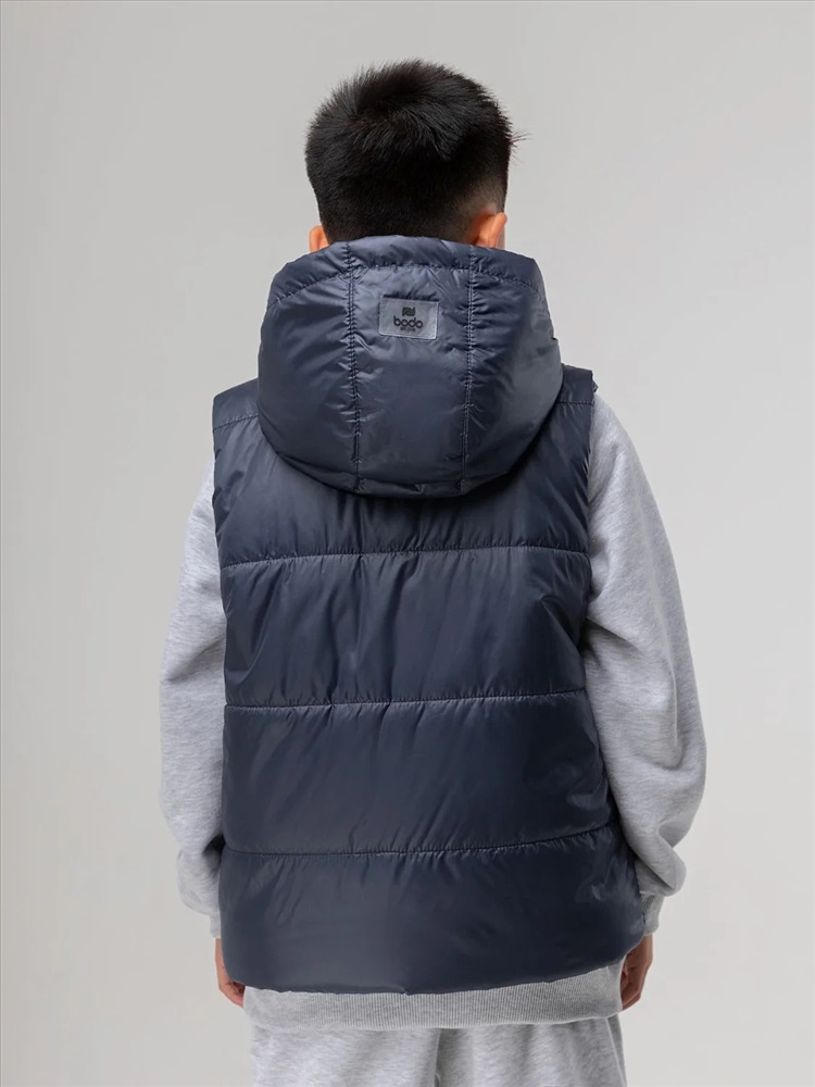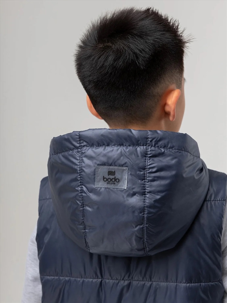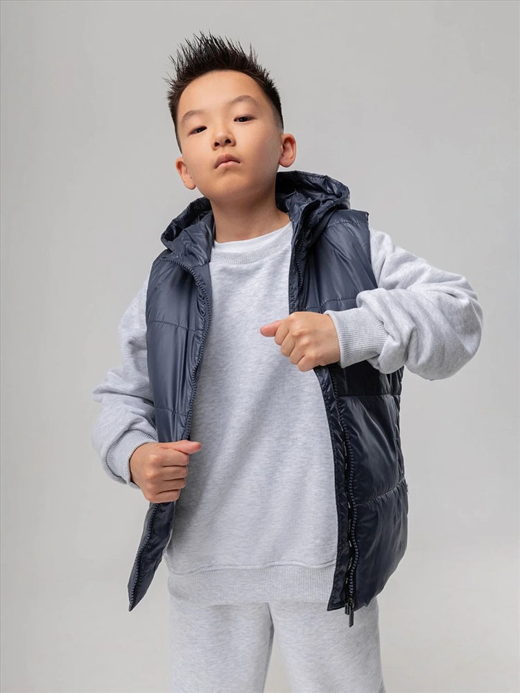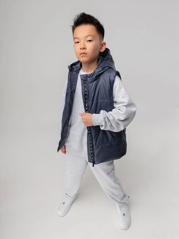 Стильный жилет с капюшоном для детей школьного возраста. Материал жилета FITSYSTEM имеет специальное водонепроницаемое и водоотталкивающее покрытие и пропитку, защищает от дождя, влаги и ветра. Материал верха: Fitsystem Style 100% полиэстер, утеплитель Hetta micro premium S4-K 150 г/кв.м, подкладочный материал кулирная гладь 100% хлопок