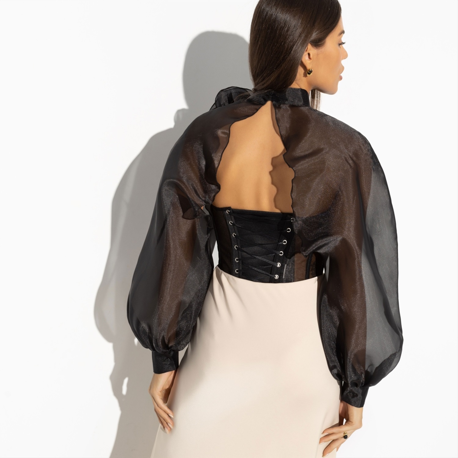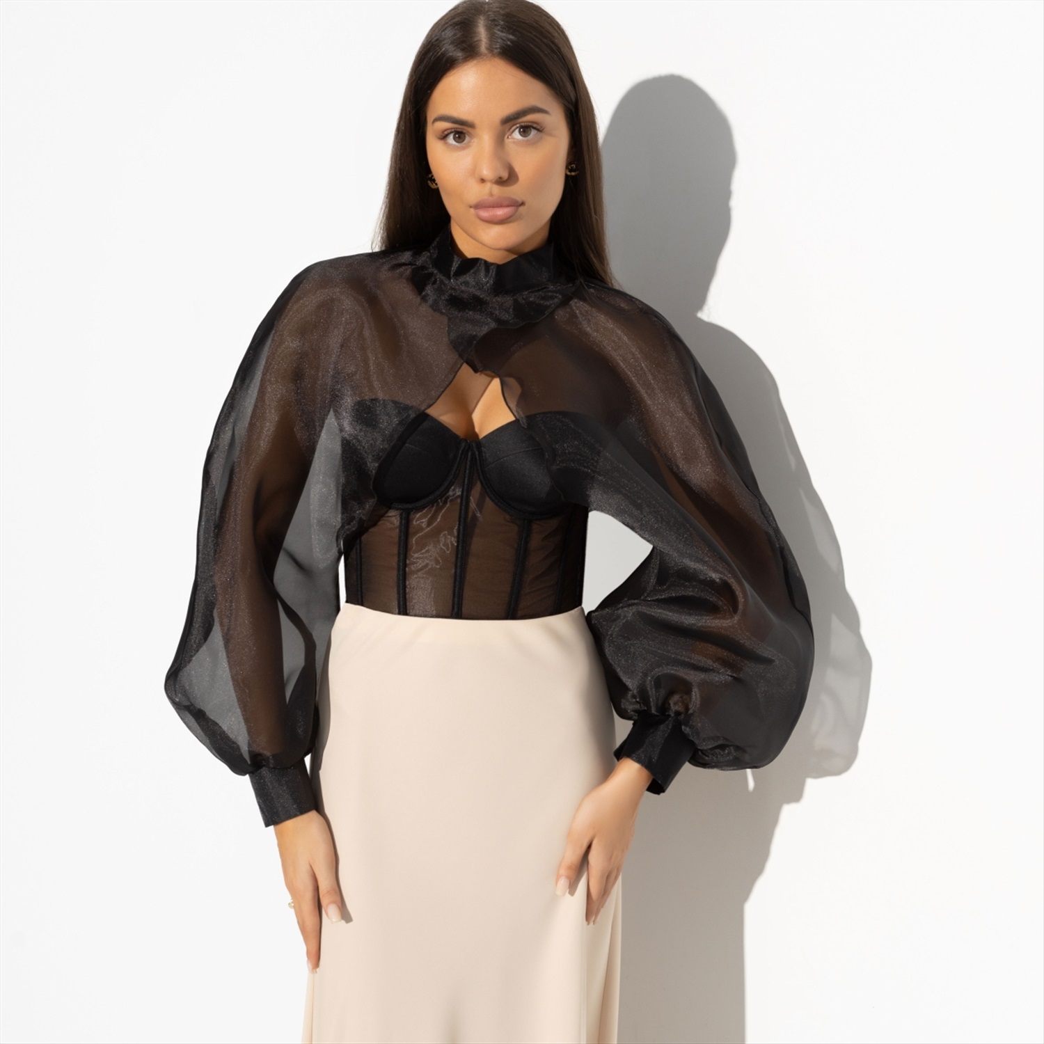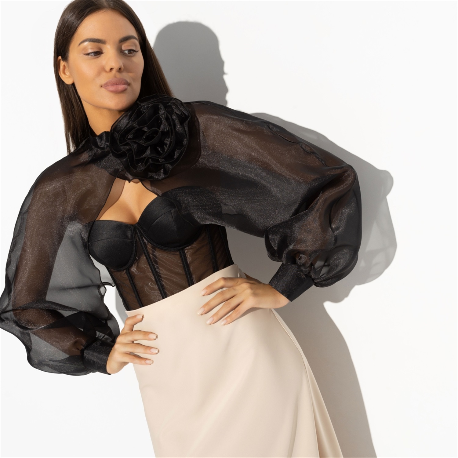 В психологии есть такое понятие, как «якорение». Символ какого-либо яркого события, для того, чтобы эмоционально запомнить его. Выбирая болеро из органзы СHARUTTI, ты заякоришь любой момент твоей жизни. Болеро с объемными рукавами и съемной брошью в комплекте. Застегивается сзади на одну пуговицу. Закрывает плечи и зону декольте. Спинка остается открытой.