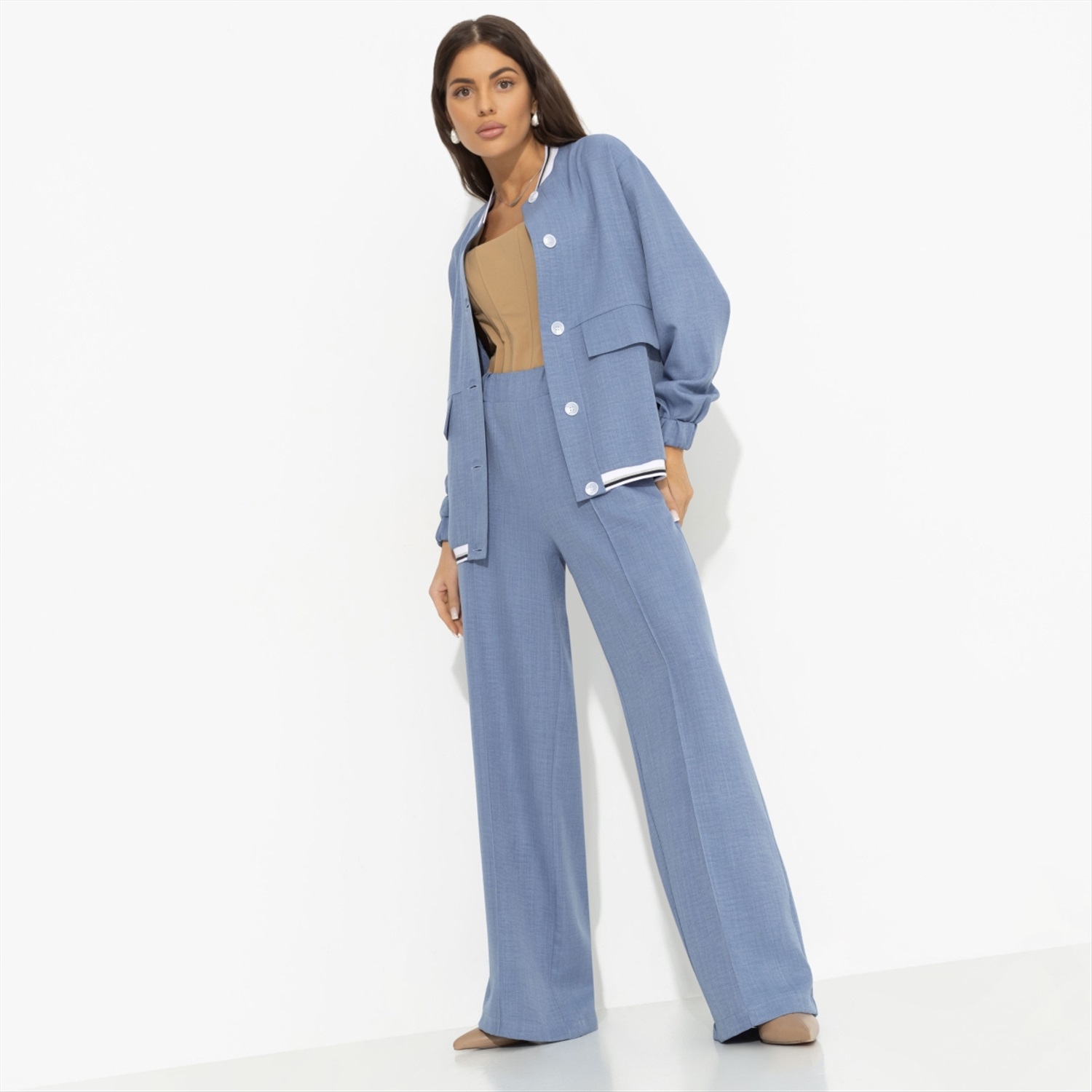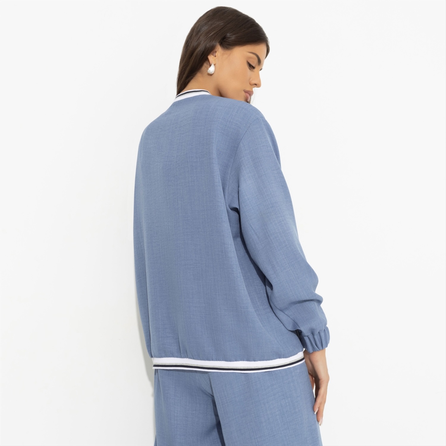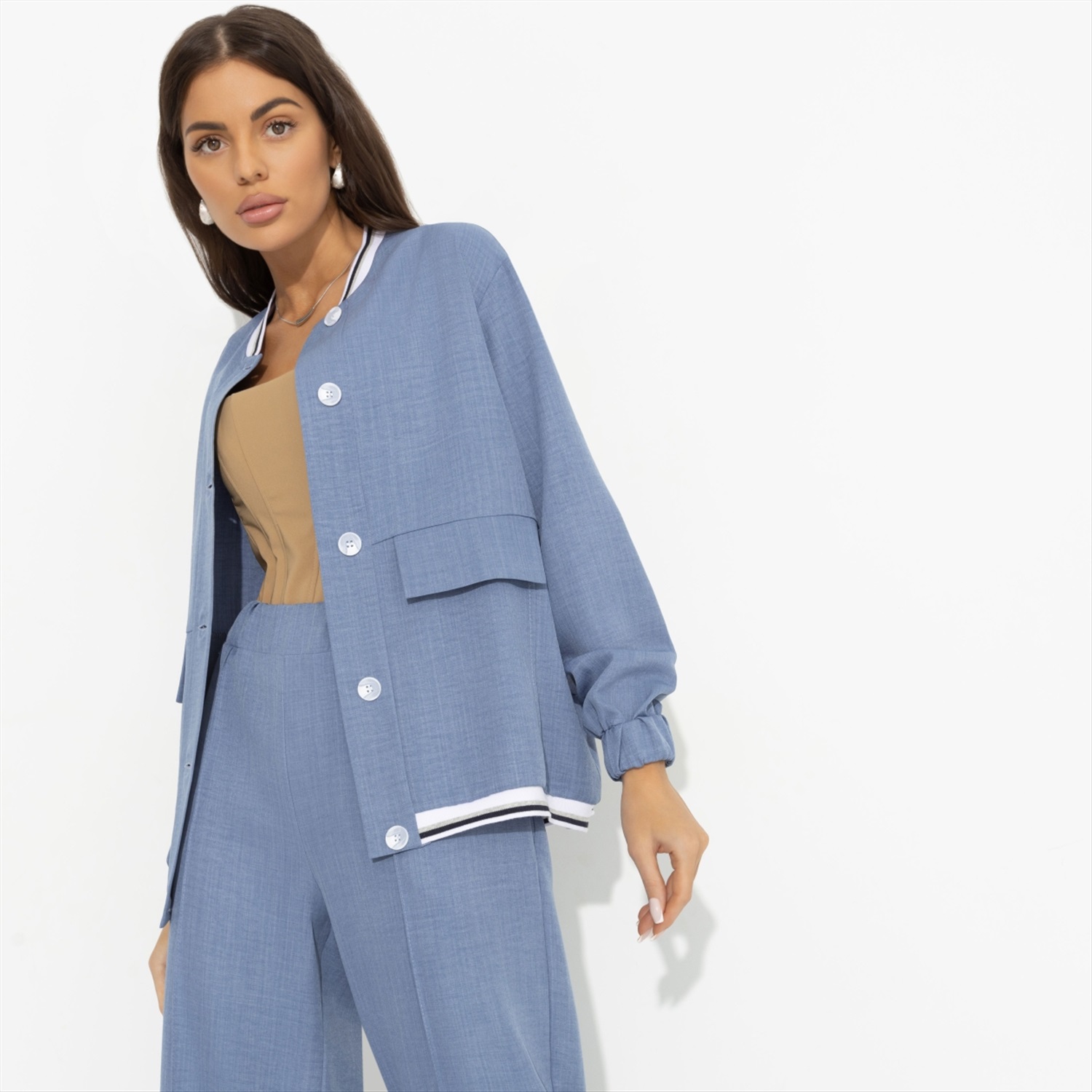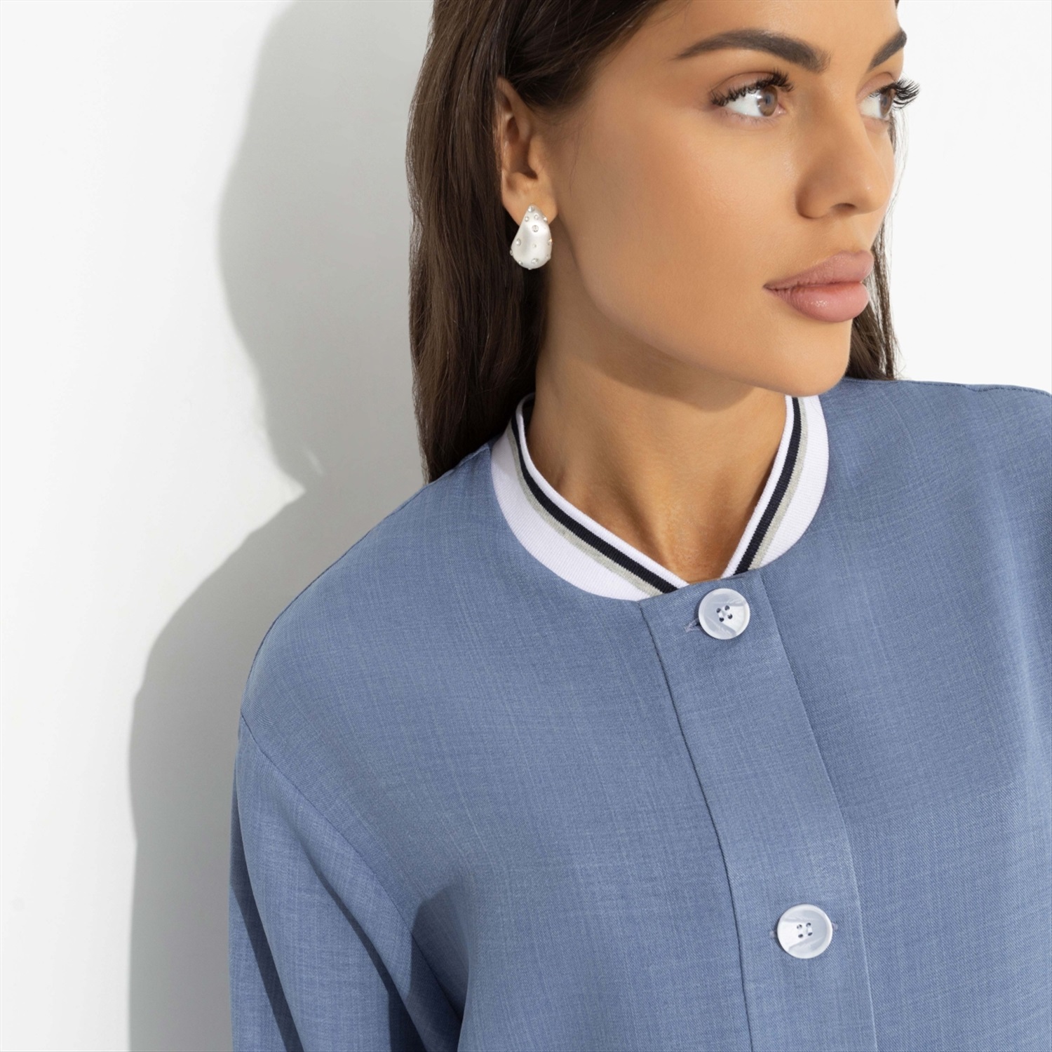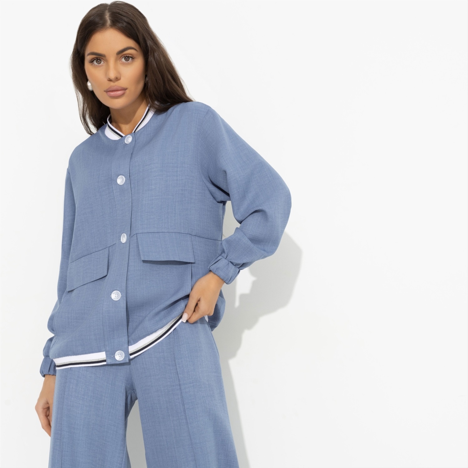 Бомбер CHARUTTI в голубом оттенке вполне может стать фирменной одеждой для охотниц за голубыми мечтами. Всех объединяет неустанное стремление к прекрасному, жажда жизни и высокий стиль. Бомбер свободного кроя. Застегивается пуговицы. Изделие с имитацией накладных карманов по передней части. Подол и ворот изделия оформлены трикотажной резинкой. Рукава также оформлены широкой скрытой резинкой.