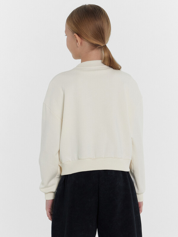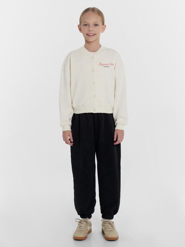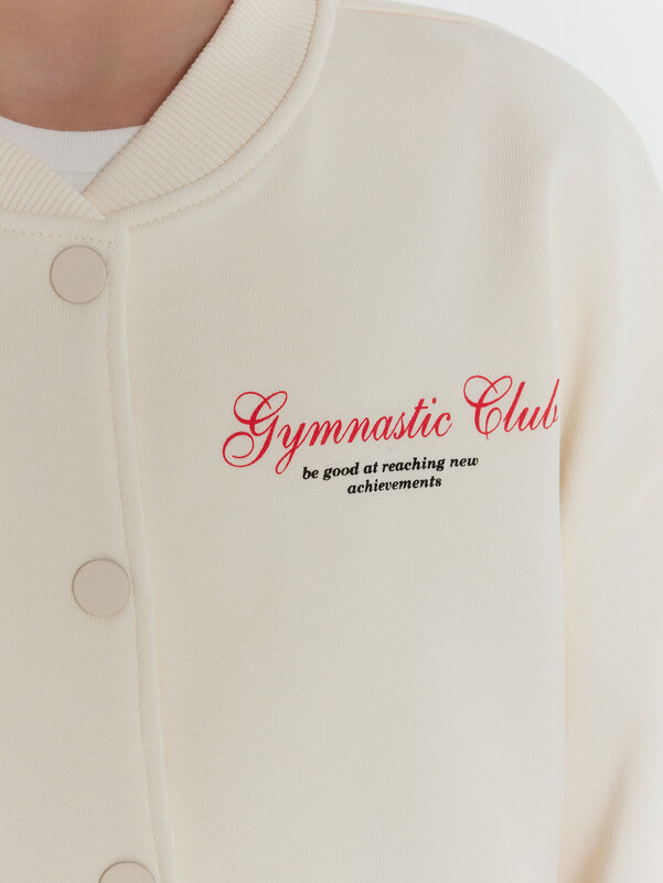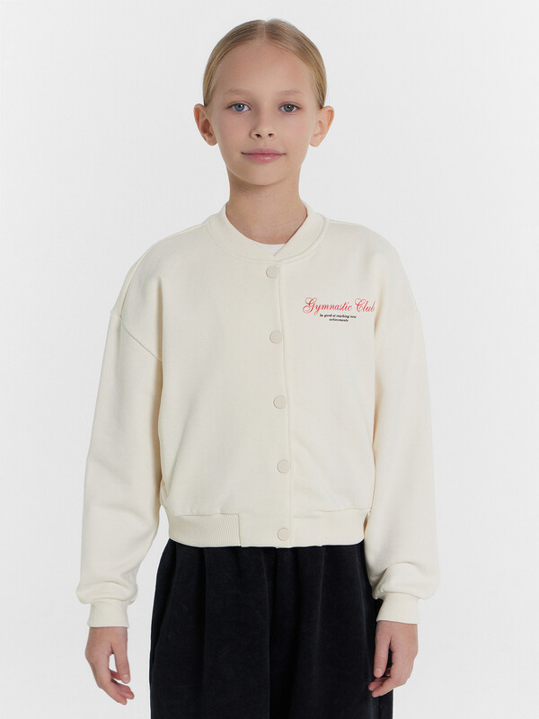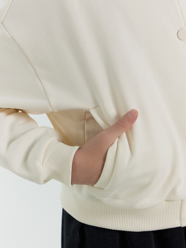 Бомбер свободного кроя. Круглый вырез горловины. В горловину втачан воротник-стойка из рибаны. Шов втачивания закрыт х/б тесьмой 10мм ,10TGY-O. Спереди застежка на кнопки 15 мм .Плечо спущено, пройма углубленна. Рукава втачные, длинные. По низу рукавов манжеты из рибаны. На деталях переда прорезные карманы . По низу изделия отрезной пояс из рибаны.