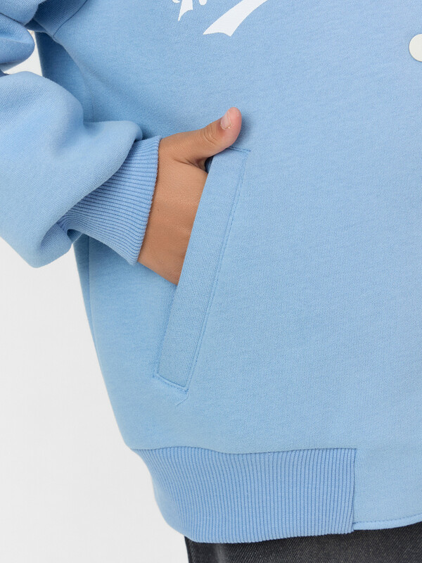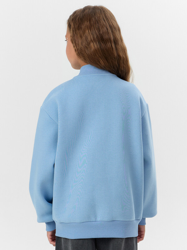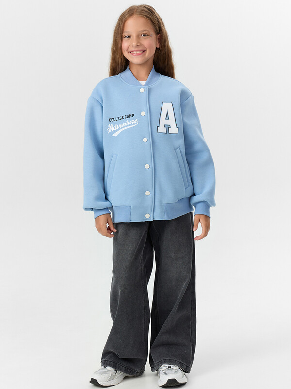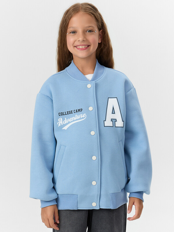Бомбер свободного кроя. Круглый вырез горловины. В горловину втачан воротник-стойка из рибаны. Шов втачивания закрыт х/б тесьмой 10мм ,10TGY-O. Спереди застежка на кнопки 15 мм .Плечо спущено, пройма углубленна. Рукава втачные, длинные. По низу рукавов манжеты из рибаны. На деталях переда прорезные карманы . По низу изделия отрезной пояс из рибаны.