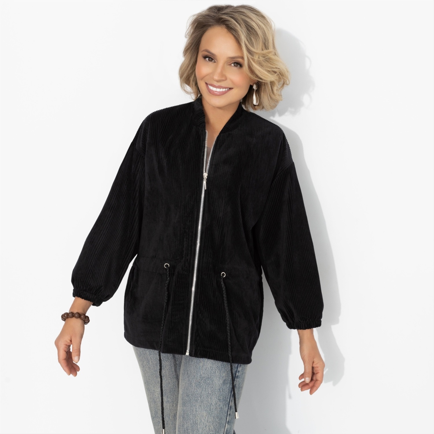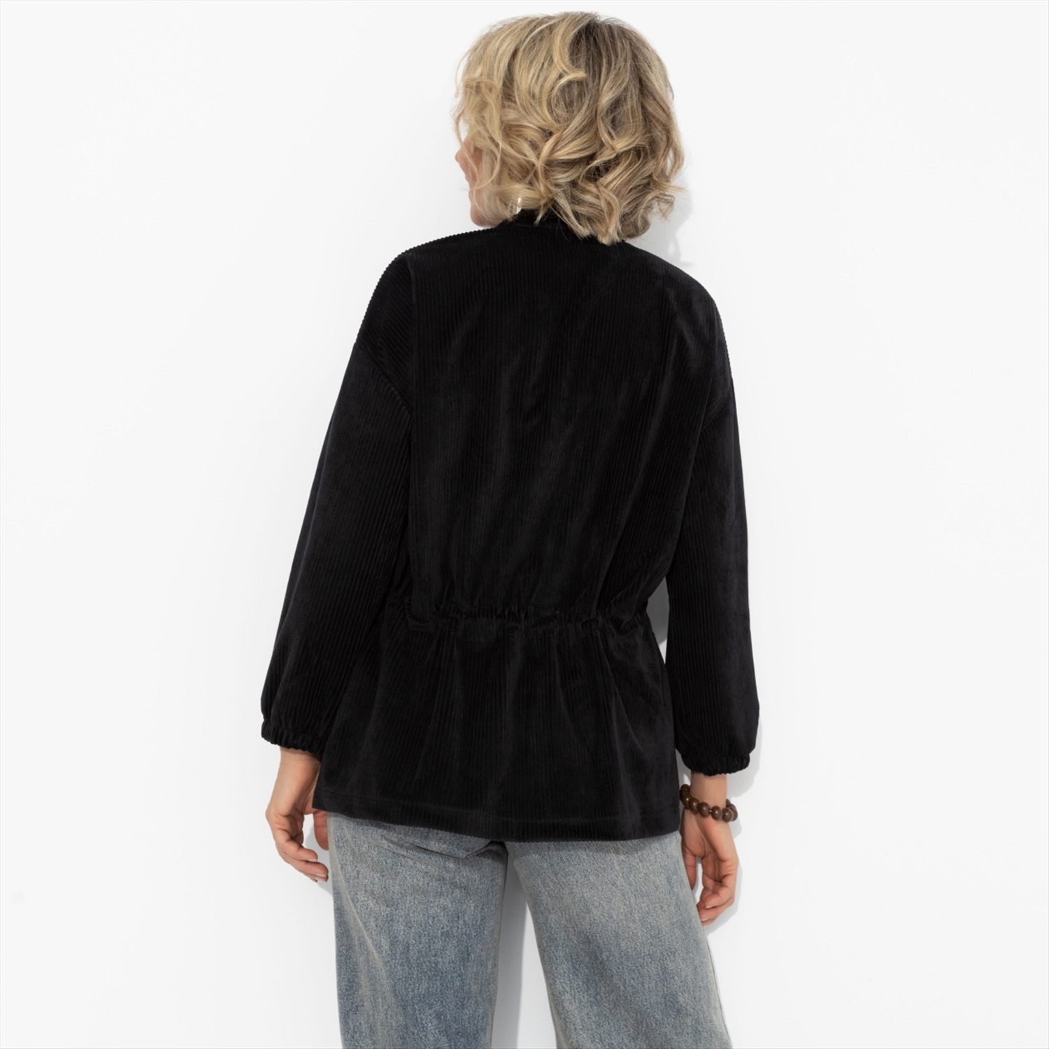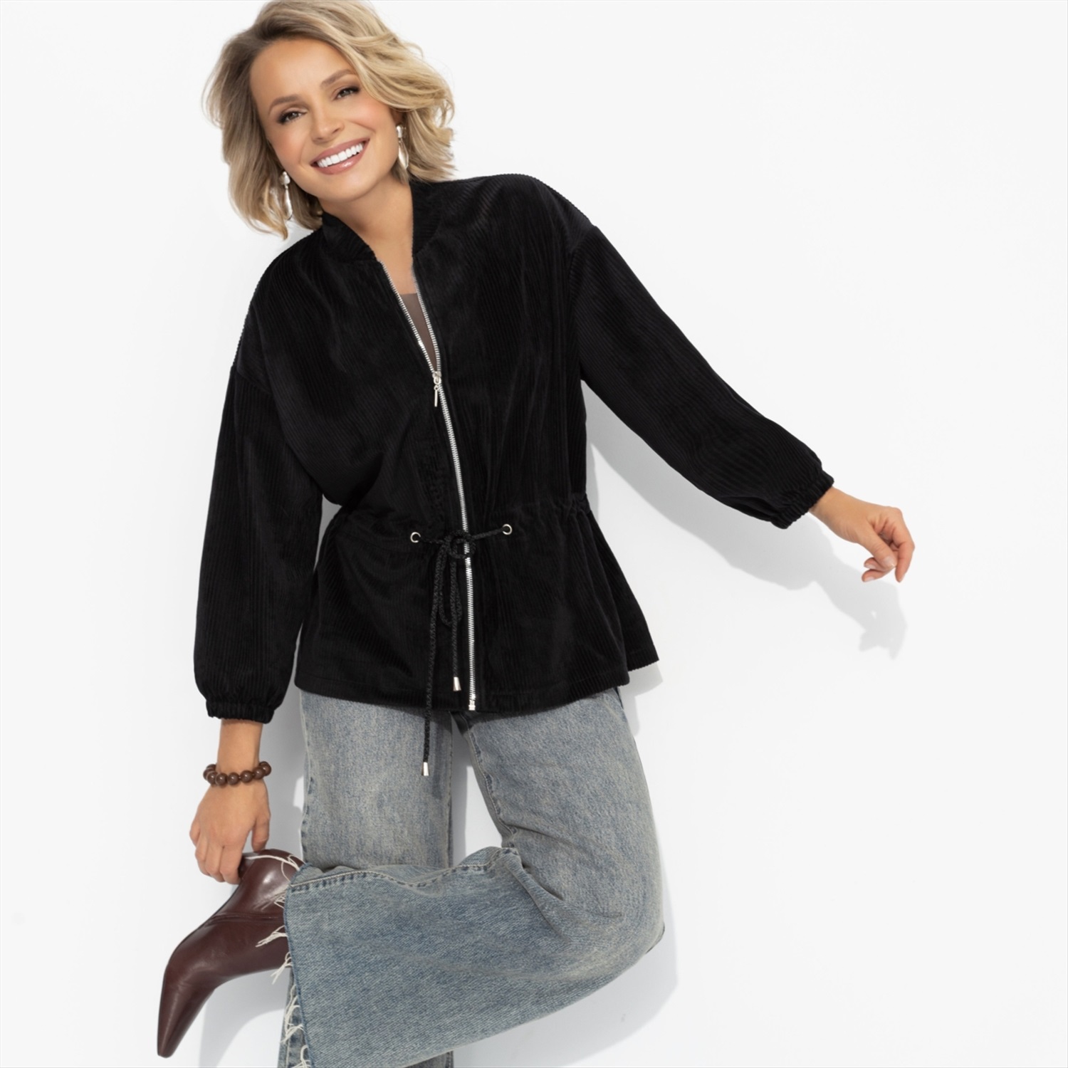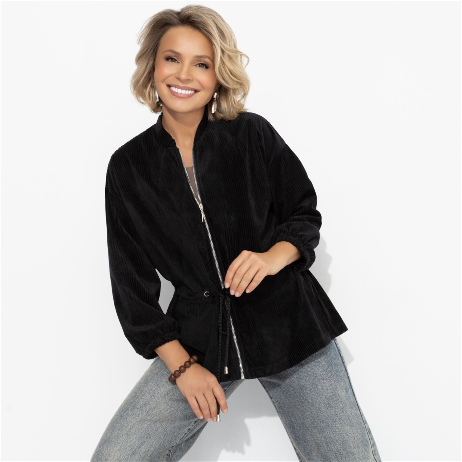 Фактурный бомбер сочетает мягкость и силу. Лаконичный чёрный, акцент на линии талии, блеск молнии – детали делают образ завершённым. Ты выбираешь – а мир подстраивается. Бомбер выполнен из мягкого трикотажа «велюр» с бархатистой поверхностью, которая красиво отражает свет и сохраняет форму. Центральная молния придаёт модели современный ритм, а регулируемая кулиска на талии позволяет варьировать силуэт от свободного до подчеркнуто женственного. Комментарии к товару