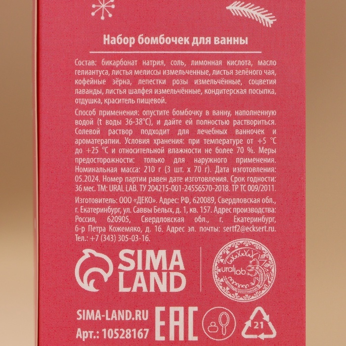 Габариты: 12 x 4 x 4 Страна: Россия В боксе: 72 набор Состав: См. на упаковке Материалы: см. на упаковке Фасовка: по 1 набор Индивидуальная упаковка: Термоусадочная пленка Сертификат: ЕАС Набор: Да Цвет: Разноцветный Для кого: Для женщины Форма: Куб В наборе, шт.: 3 Вес, г/Объём, мл: 70 Вес, г: 210 Тематика: Новогодняя Вид упаковки: Подарочная коробка Символ года: Нет Тематика праздника: Новый год Адресат: Без адресата Возраст: Взрослый Область применения: Для тела Аромат: Ваниль Составляющие набора: Бомбочка для ванн Темпер. ограничение НЕ НИЖЕ ℃: +5 Темпер. ограничение НЕ ВЫШЕ ℃: +25 Возраст: Для взрослых Возраст: Для всех возрастов Назначение: Тонизирование Особенности: С сухоцветом ![]()