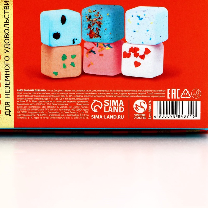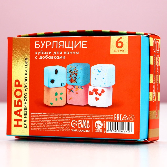 Производитель: Чистое счастье Габариты: 9,5 x 13 x 5 Страна: Россия В боксе: 16 набор Состав: См. на упаковке Материалы: см. на упаковке Фасовка: по 1 набор Индивидуальная упаковка: Термоусадочная пленка Сертификат: ЕАС Набор: Да Цвет: Разноцветный Для кого: Для женщины Форма: Куб В наборе, шт.: 6 Вес, г/Объём, мл: 70 Вес, г: 70 Тематика: Новогодняя Вид упаковки: Коробка картонная Символ года: Нет Тематика праздника: Новый год Адресат: Без адресата Возраст: Взрослый Область применения: Для тела Аромат: Ягоды Составляющие набора: Бомбочка для ванн Темпер. ограничение НЕ НИЖЕ ℃: +5 Темпер. ограничение НЕ ВЫШЕ ℃: +25 Возраст: Для взрослых Возраст: Для всех возрастов Назначение: Тонизирование Особенности: С сухоцветом