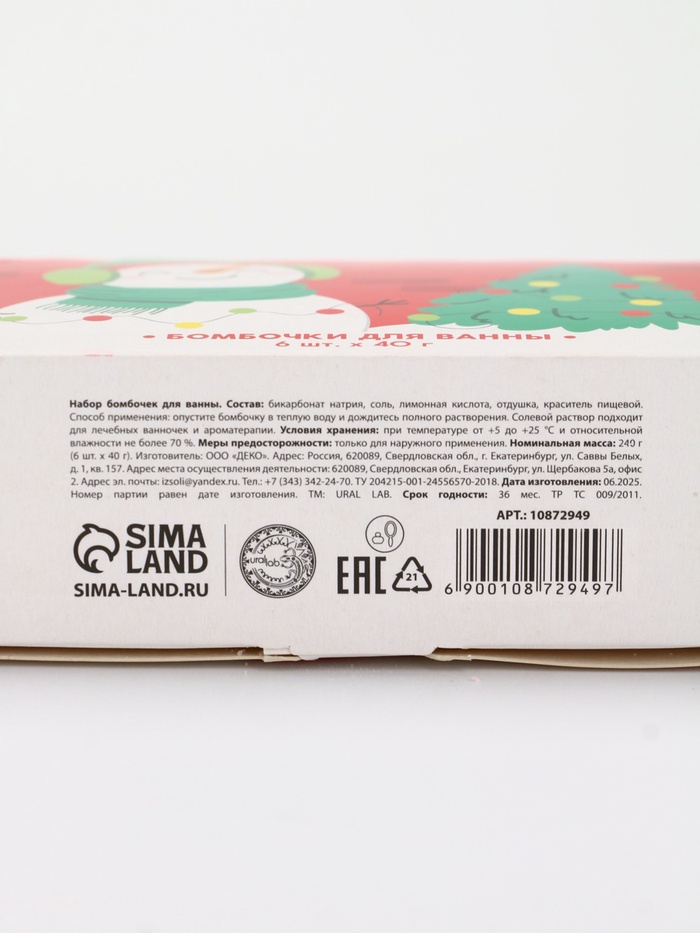 Габариты: 4 x 12 x 10,5 Страна: Россия В боксе: 30 набор Состав: См. на упаковке Материалы: см. на упаковке Фасовка: по 1 набор Индивидуальная упаковка: Плёнка Сертификат: ЕАС Набор: Да Для кого: Для женщины Форма: Шар В наборе, шт.: 6 Вес, г: 240 Вид упаковки: Подарочная коробка Символ года: Нет Тематика праздника: Новый год Адресат: Без адресата Возраст: Взрослый Составляющие набора: Бомбочка для ванн Темпер. ограничение НЕ НИЖЕ ℃: +5 Темпер. ограничение НЕ ВЫШЕ ℃: +25 Возраст: Для взрослых Особенности: Без особенностей Комментарии к товару
