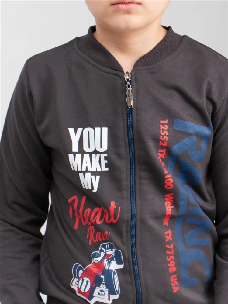 Бомбер для мальчика украшенный оригинальными принтами, с застежкой на молнии. На рукавах и по низу изделия широкие эластичные манжеты. Модель идеально сочетается с брюками, джинсами. Великолепный выбор для стильного образа на каждый день.