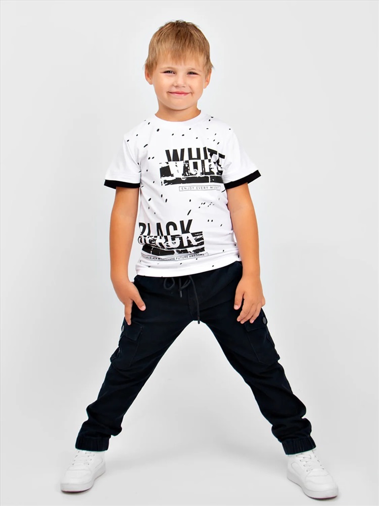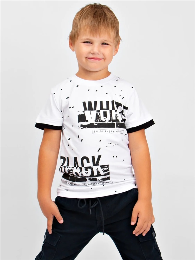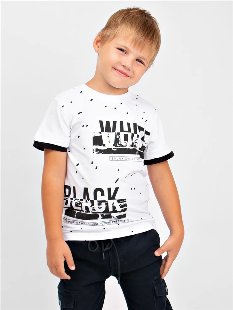 Комфортная футболка свободного силуэта для мальчика. Ткань-кулирка отлично впитывает влагу и пропускает воздух. Прекрасный выбор на каждый день для дома, прогулки или детского сада.