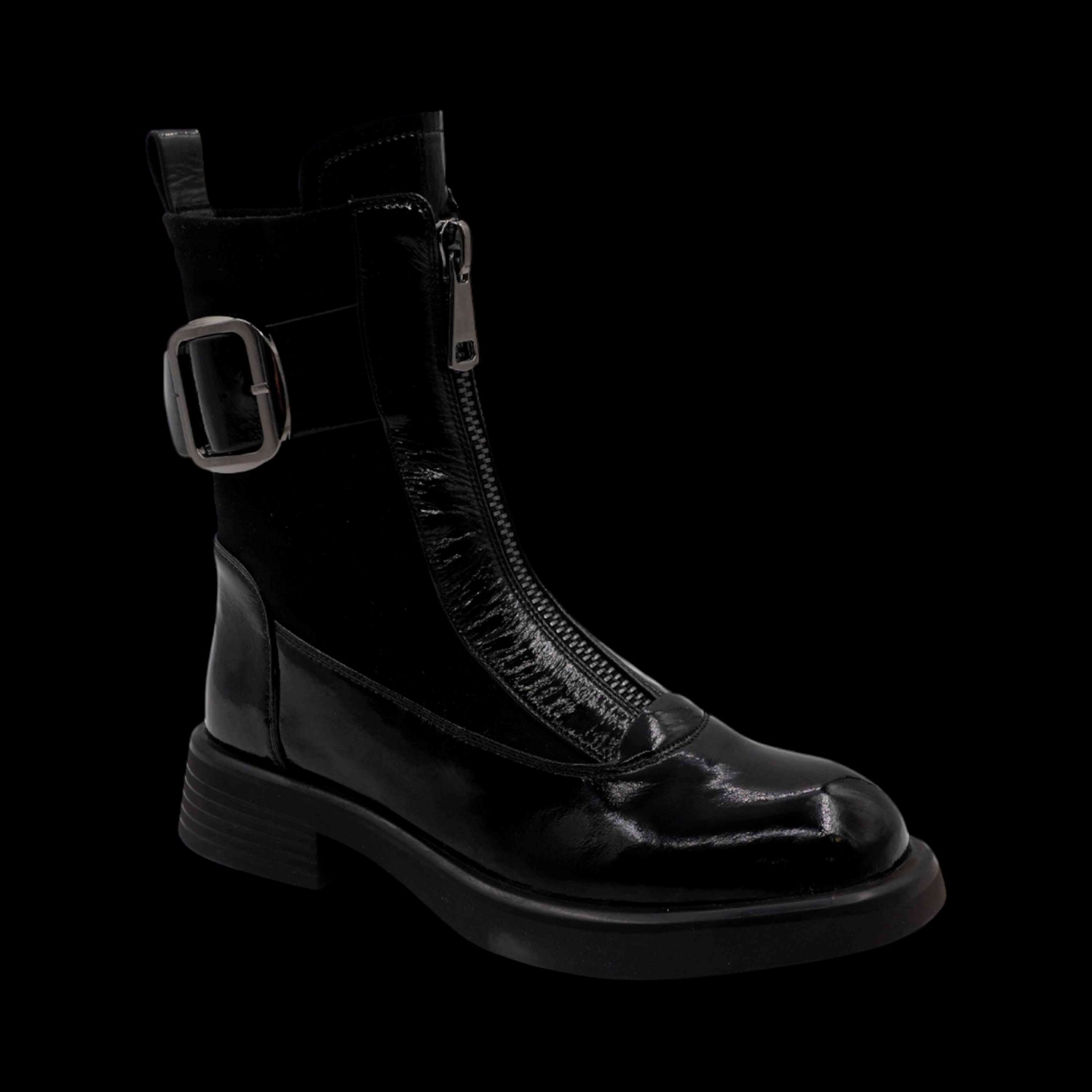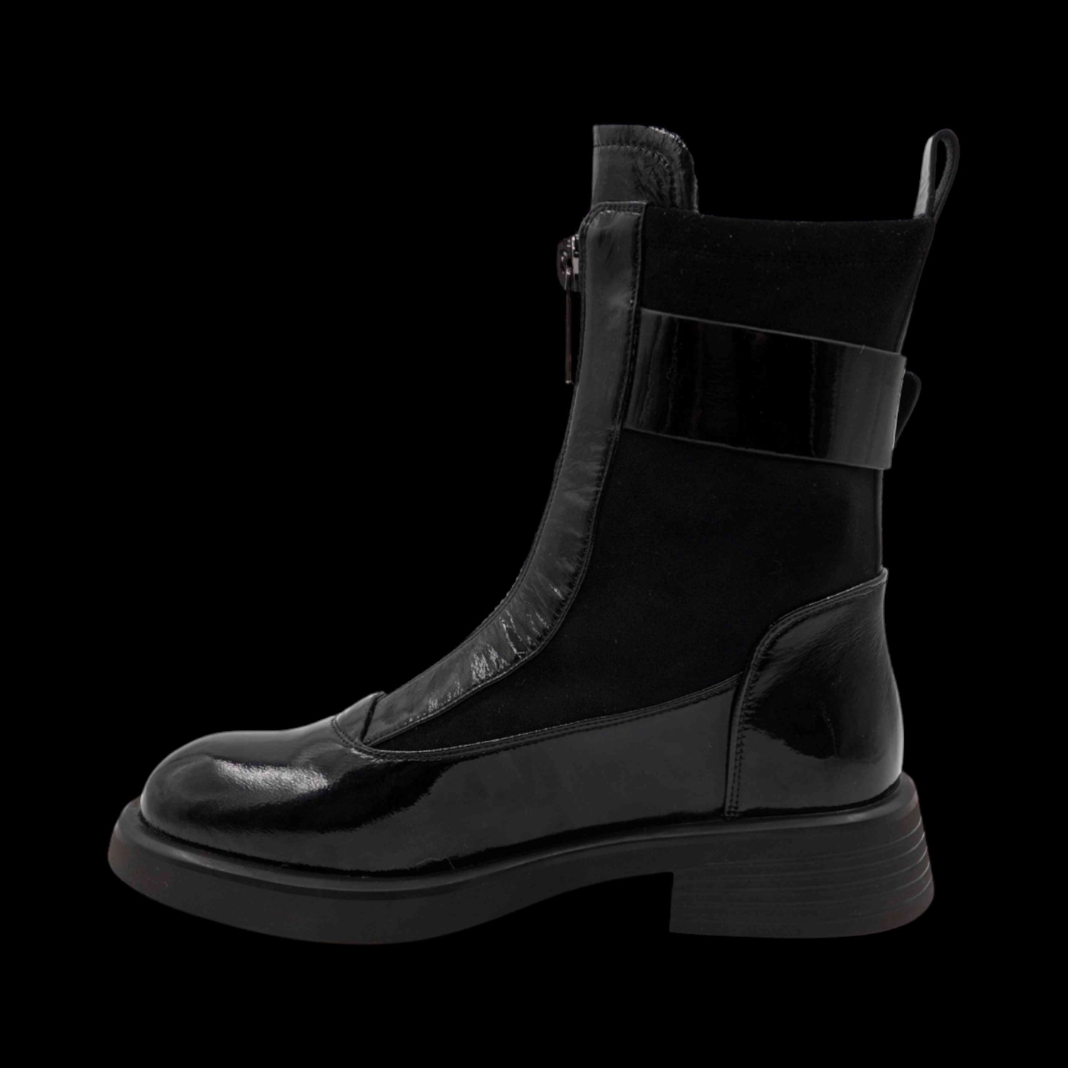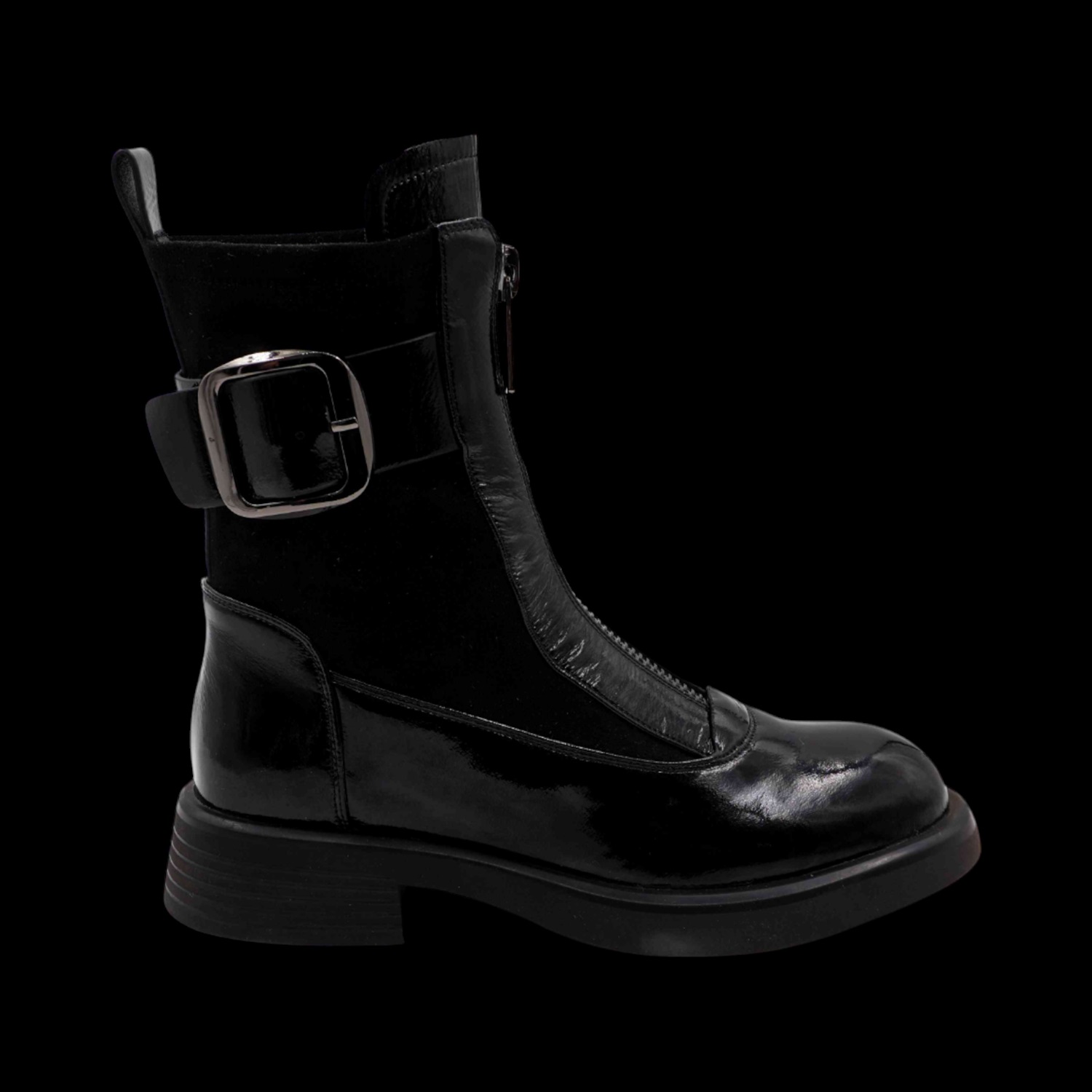 Лакированные ботинки на низком каблуке и тонкой подошве – идеальный выбор для женщин, желающих выглядеть элегантно и стильно в любое время года. Они представляют собой комбинацию классики и современных тенденций моды. Особенности дизайна – круглый носок, ассиметричная боковая стрейч-вставка и широкий декоративный ремешок, украшающий верх голенища.