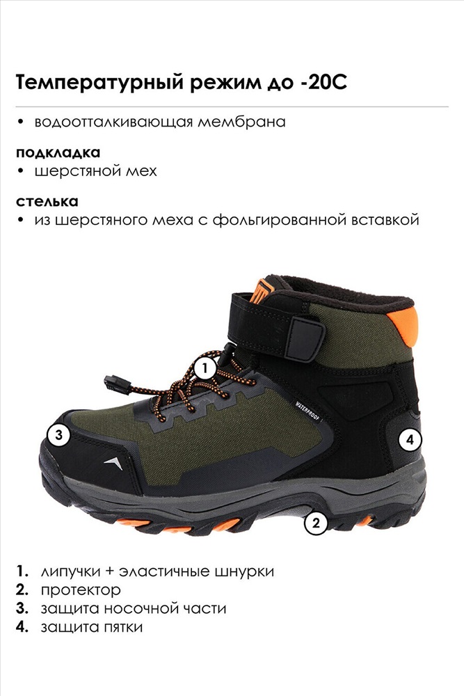 ID товара: 913697 Состав: Основной материал- 100% Полиэстер Дополнительный материал- 100% Искусственная кожа Сезон: Осень/Зима Основная ткань: Полиэстер Страна бренда: Германия Страна производства: Китай Конструкция верха изготовлена с использованием мембранных технологий. Усиленная защита носка и пятки специальными материалами. Подкладка и стелька выполнены из шерстяного меха 80%. Трехслойная стелька с фольгой, которая обеспечивает сохранение тепла в течение длительного времени. Формоустойчивый задник поддерживает стопу в правильном положении. Подошва имеет противоскользящий протектор. Удобная застежка-липучка и шнурок-утяжка. Рекомендованный температурный режим от 0°С до -20°С. Комментарии к товару