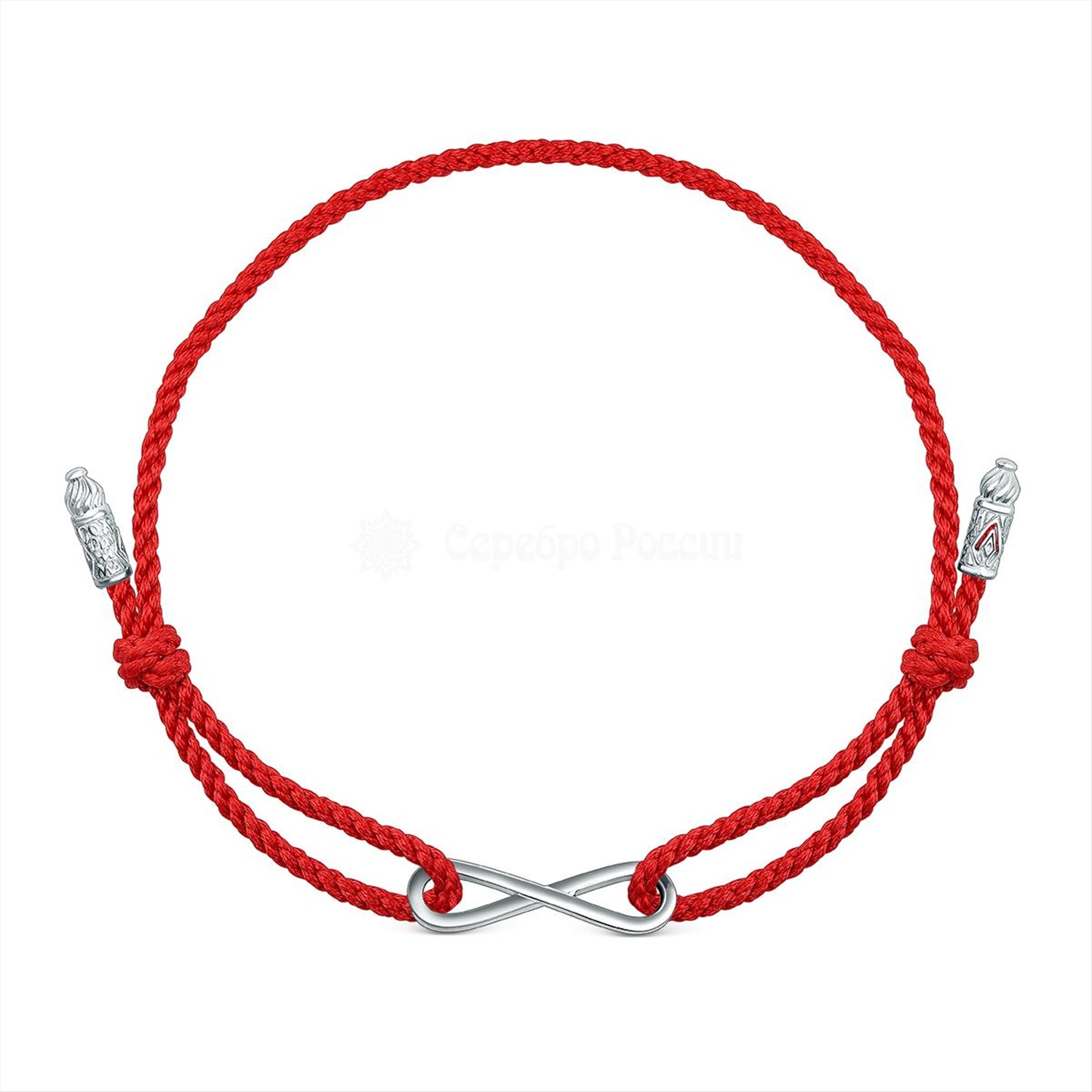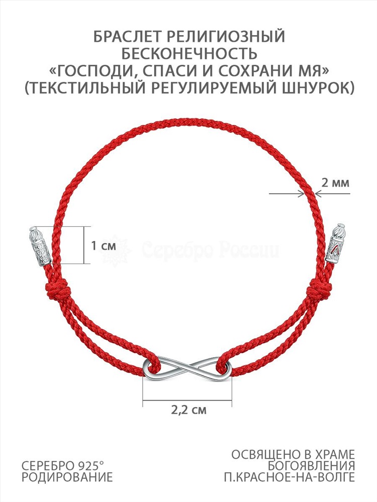 Браслет красный текстильный из родированного серебра - Бесконечность/ Господи, спаси и сохрани мя Бр-2021р