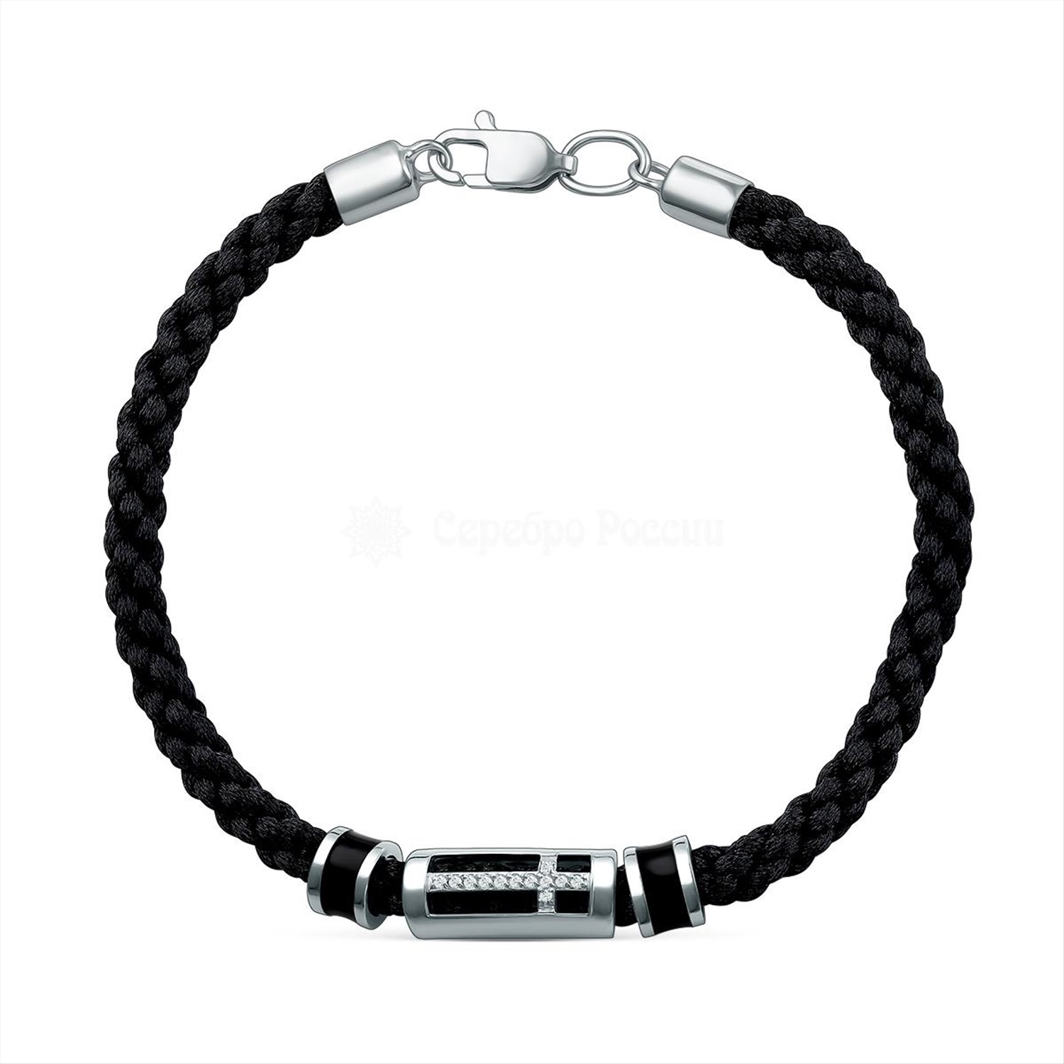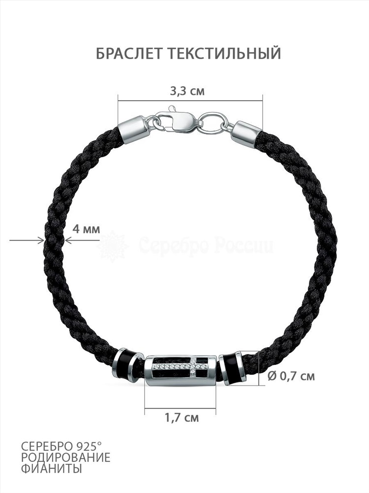 Браслет текстильный из серебра с фианитами родированный - Крест 3141060546