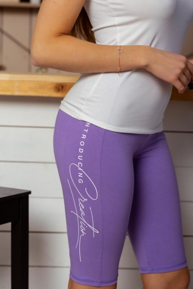 Бриджи-велосипедки облегающие, длинной выше колена, сверху на резинке. Вдоль боковых швов расположены лампасы с принтом. Можно составить комплект с майкой 8238