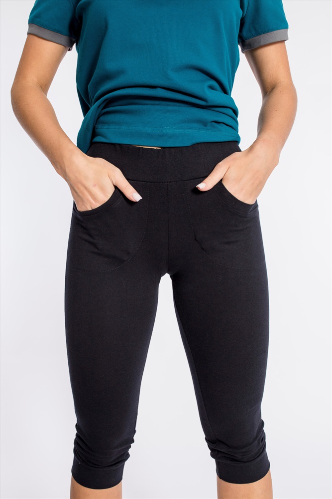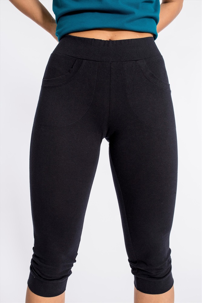 Бриджи женские выполнены из однотонного хлопкового полотна с добавлением лайкры. Силуэт облегающий, низ на манжете. Спереди размещены два кармана, пояс на резинке.