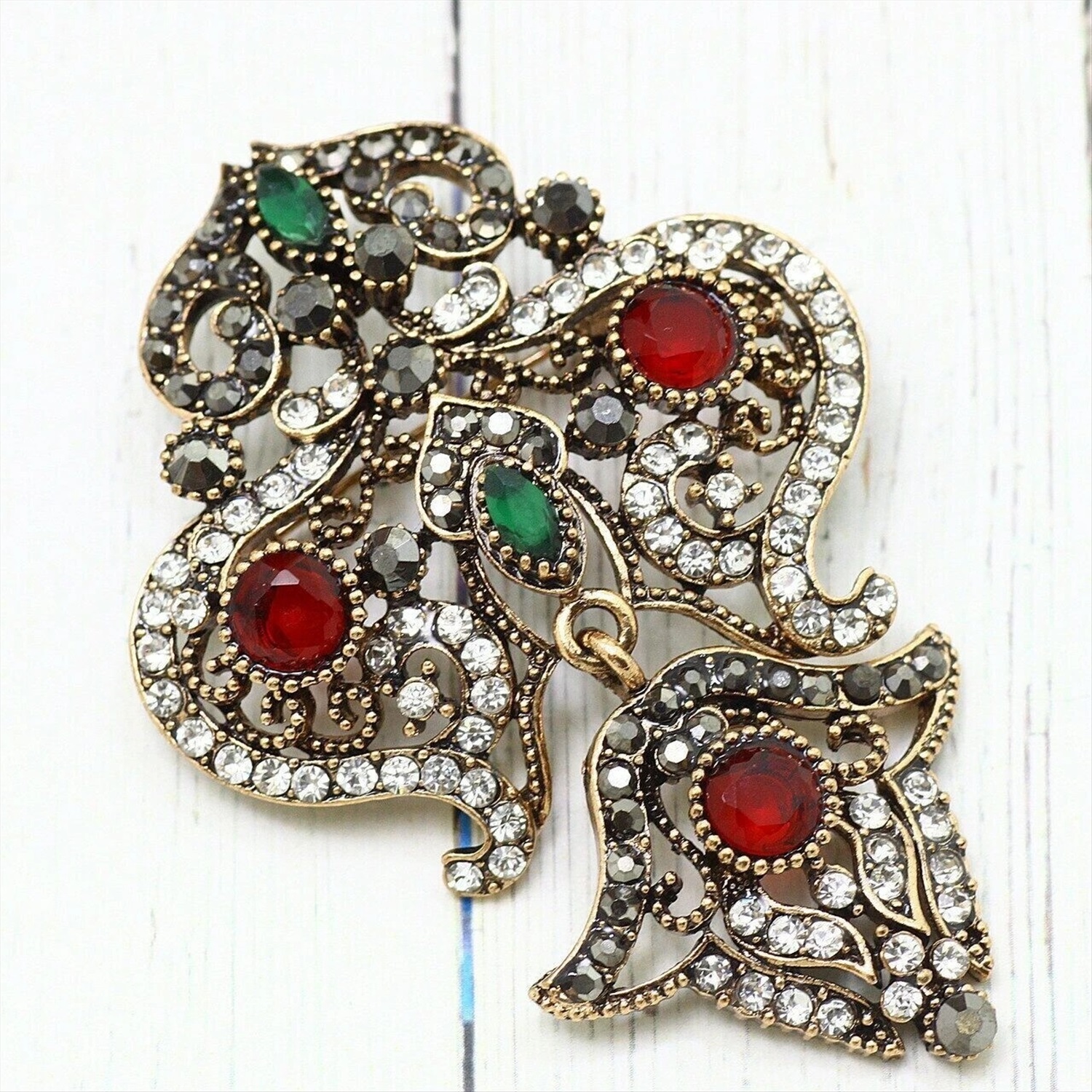 Красивая брошь восточного стиля из специального гипоаллергенного ювелирного сплава,который покрыт золотом или устойчивым родиевым покрытием, предотвращающим раздражение кожных покровов.