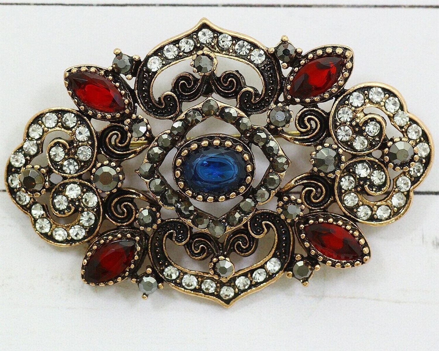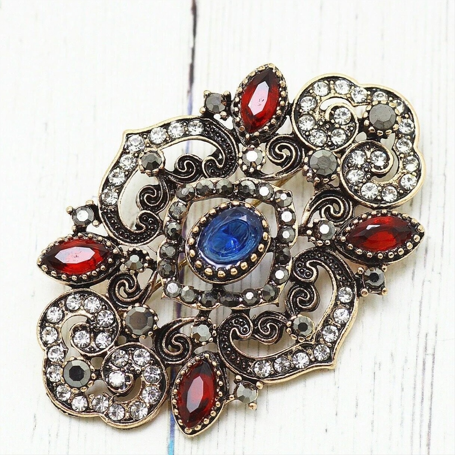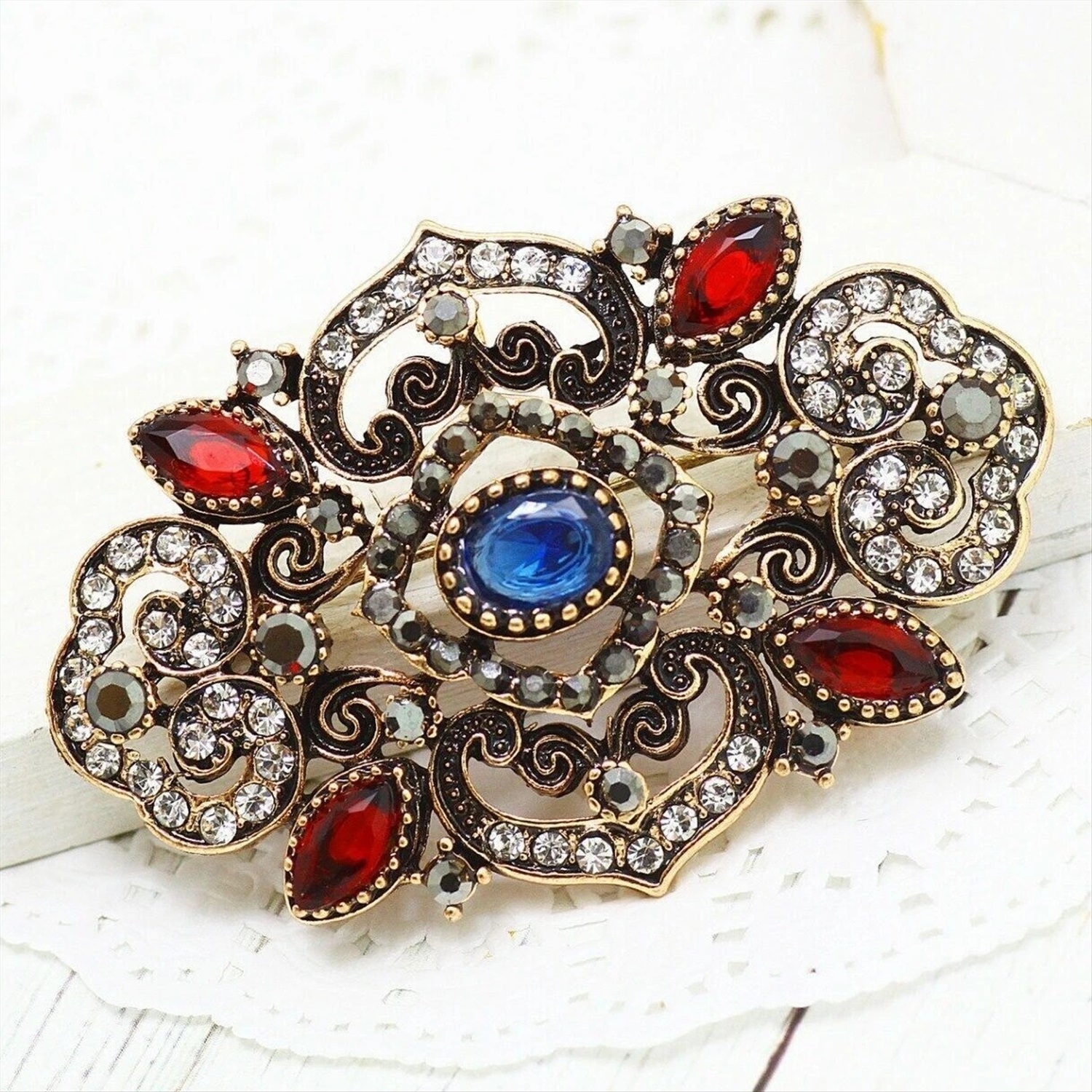 Красивая брошь восточного стиля из специального гипоаллергенного ювелирного сплава,который покрыт золотом или устойчивым родиевым покрытием, предотвращающим раздражение кожных покровов.