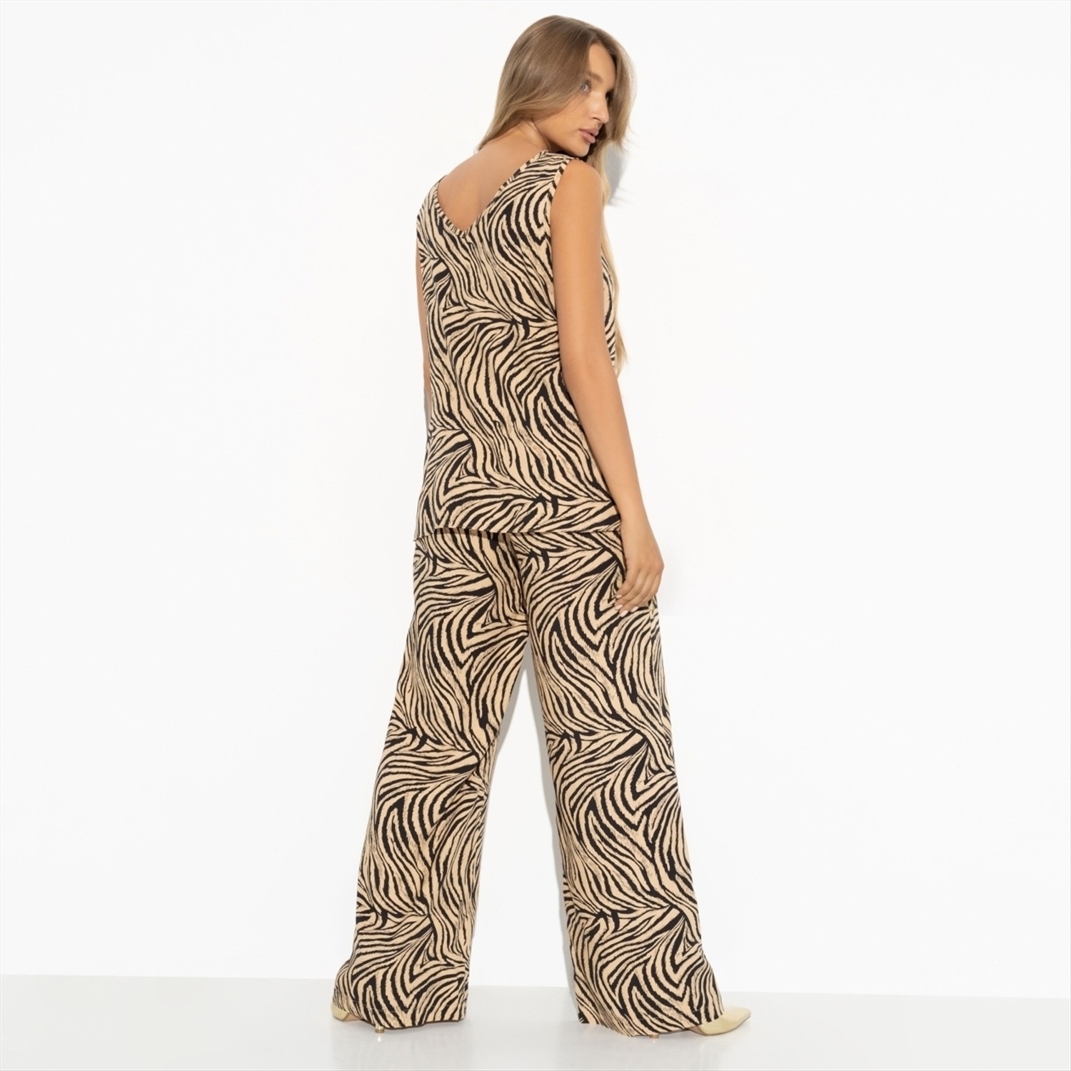 «С тобой хоть на край света!» – сказал он. А ты и рада. Комплект в стиле сафари полностью отражает твою суть. Ты уверена в себе, грациозна и иногда опасна. Так что можно и на край света. В составе комплекта топ без рукавов и брюки свободного кроя. Состав ткани – 100% вискоза. Топ классического фасона, длина до линии бедра. Брюки свободные на завязках, длина для среднего роста.
