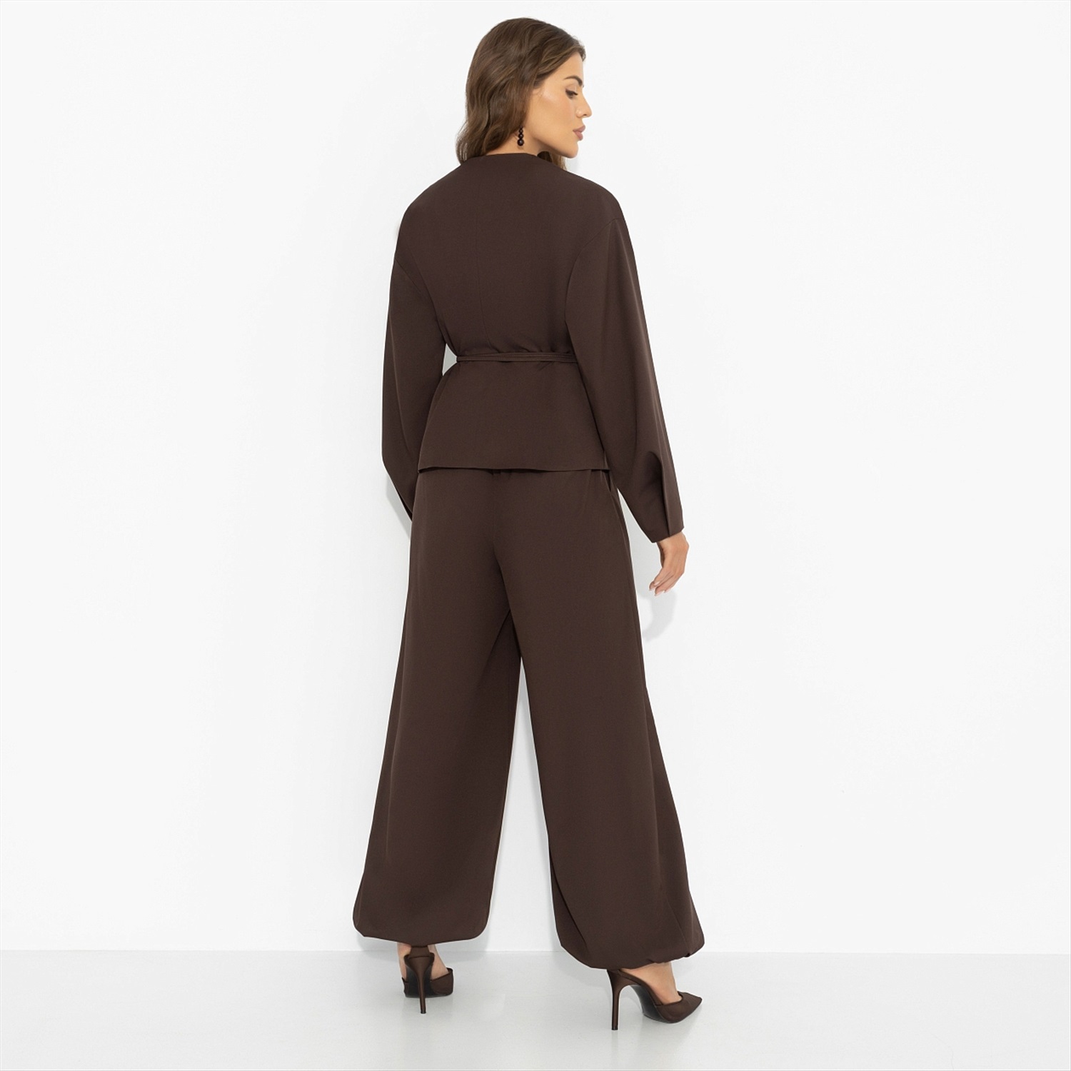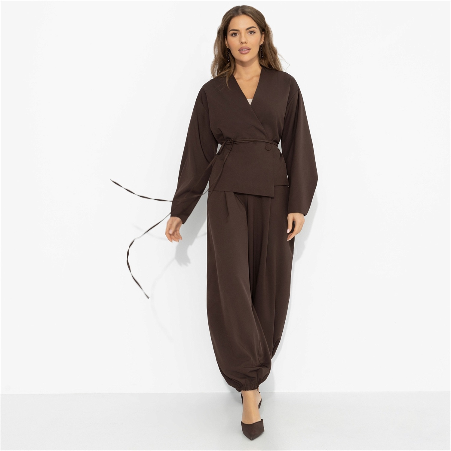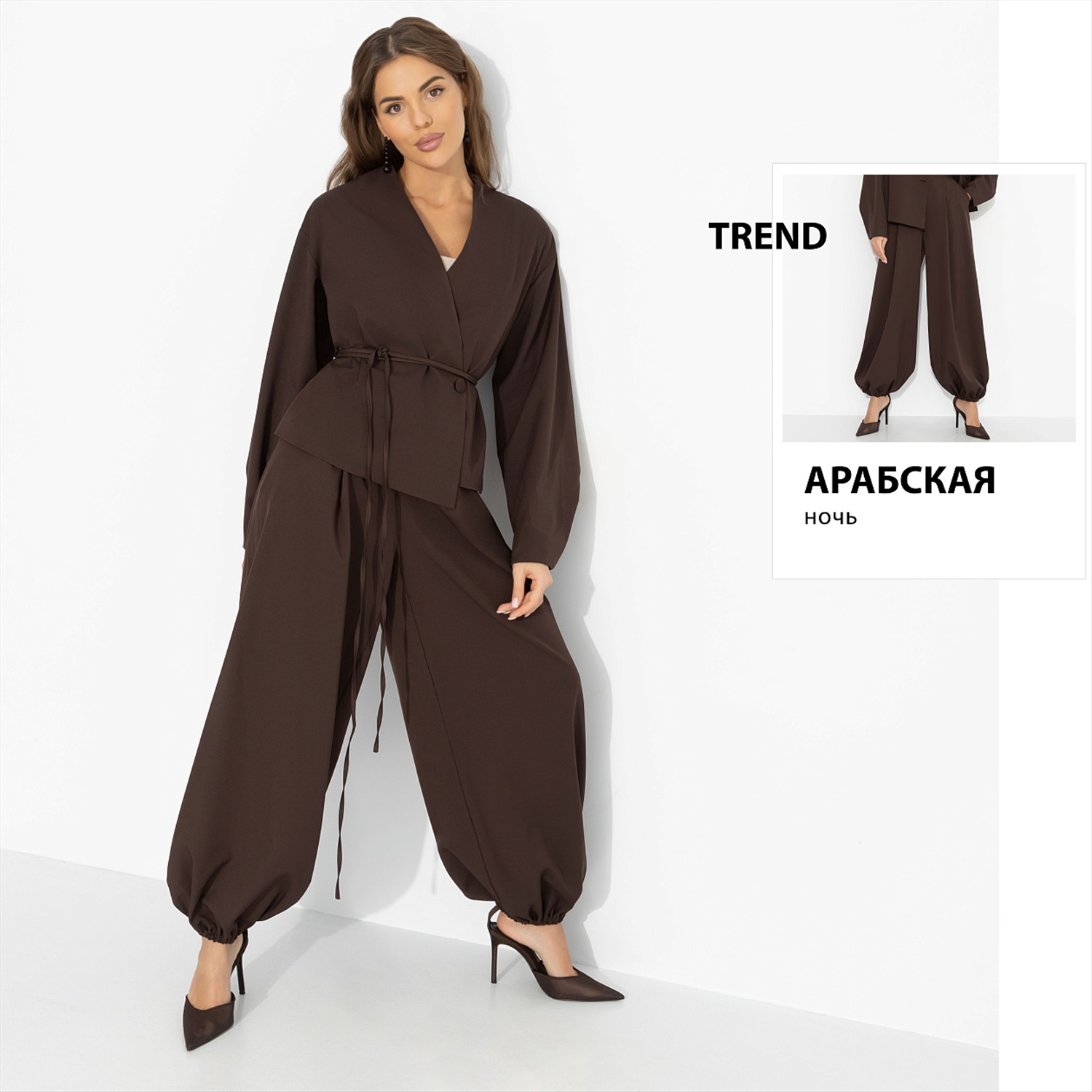 Кофе выпит, чашка перевёрнута, пальцы скользят по тёплому фарфору – на кофейной гуще уже проступают линии судьбы. Кто-то видит в них дорогу, кто-то – долгожданную встречу. Ты просто улыбаешься, ведь уже знаешь, как всё будет. Шоколадный оттенок звучит как восточная притча – густо, глубоко, с обещанием тайного поворота. Комплект в восточном стиле дарит комфорт и живое движение. Образ для тех, кто чувствует своё предназначение.
