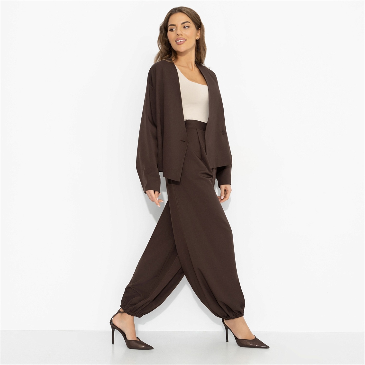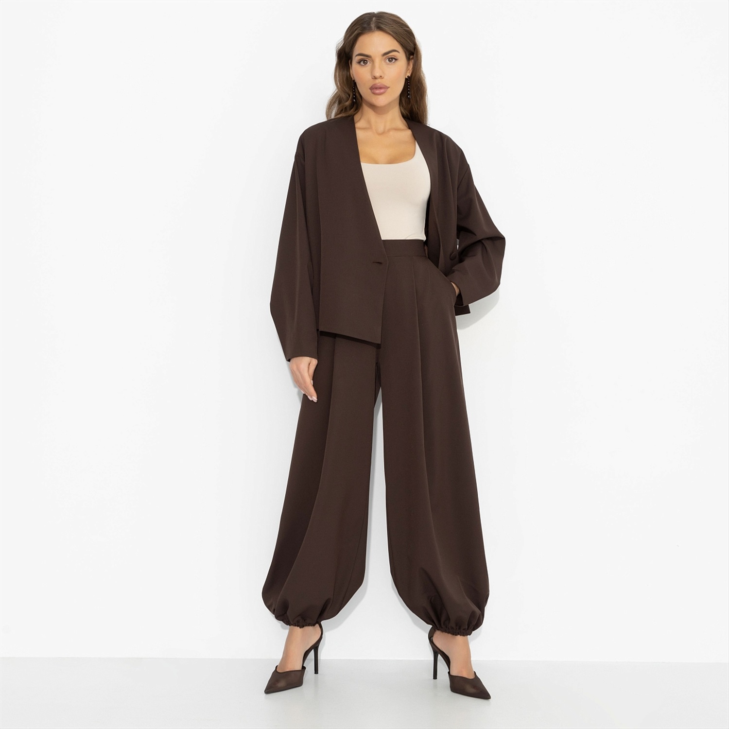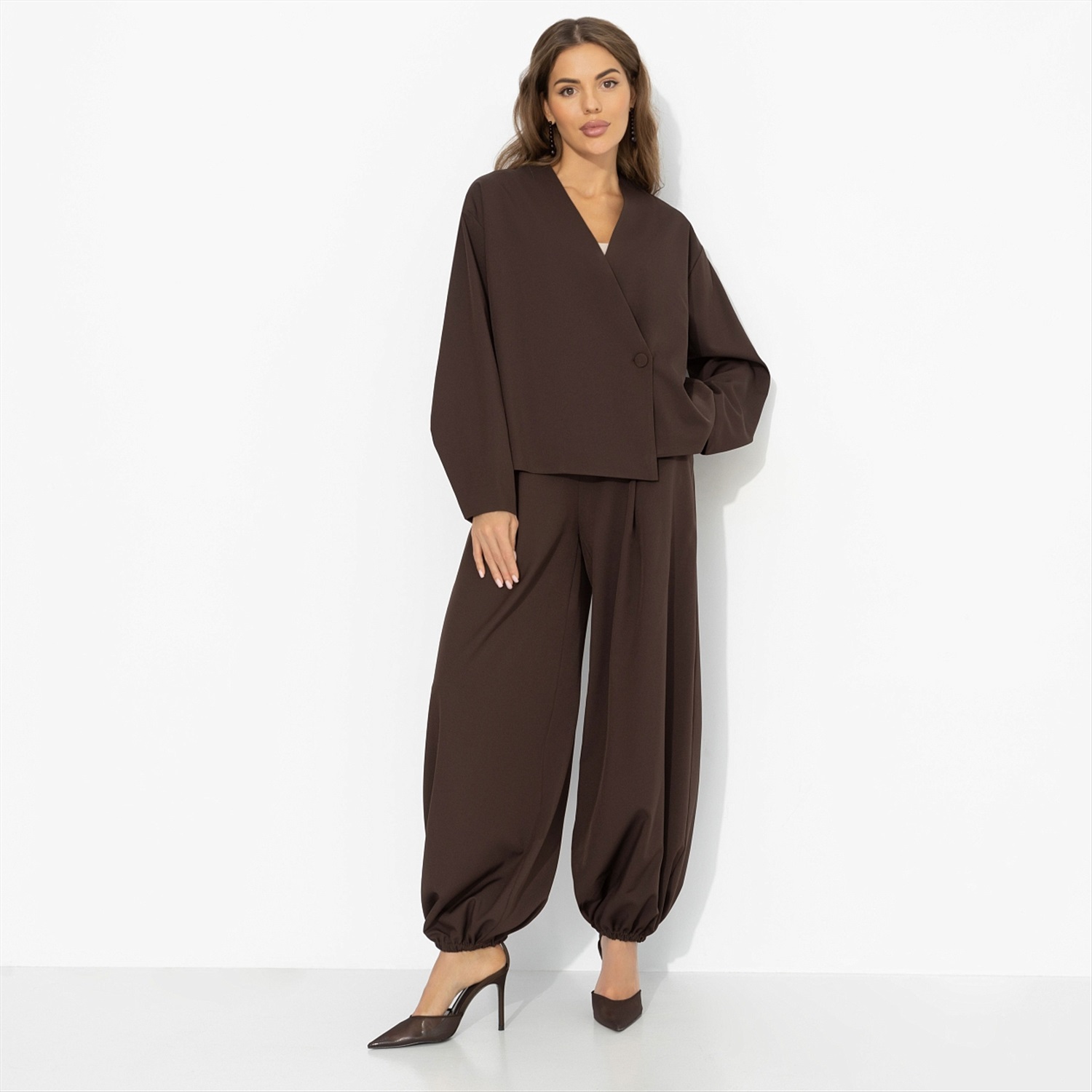 Кофе выпит, чашка перевёрнута, пальцы скользят по тёплому фарфору – на кофейной гуще уже проступают линии судьбы. Кто-то видит в них дорогу, кто-то – долгожданную встречу. Ты просто улыбаешься, ведь уже знаешь, как всё будет. Шоколадный оттенок звучит как восточная притча – густо, глубоко, с обещанием тайного поворота. Комплект в восточном стиле дарит комфорт и живое движение. Образ для тех, кто чувствует своё предназначение.