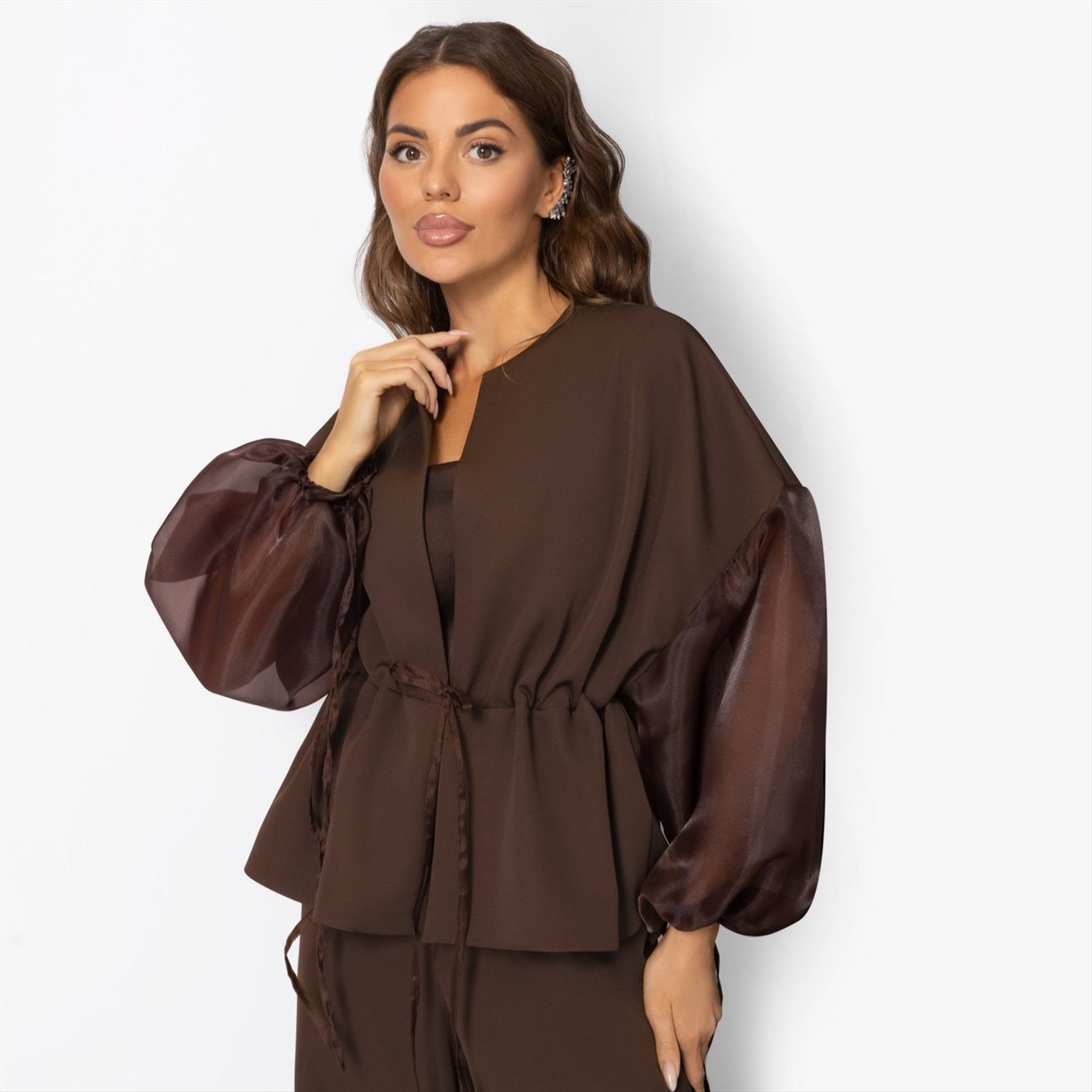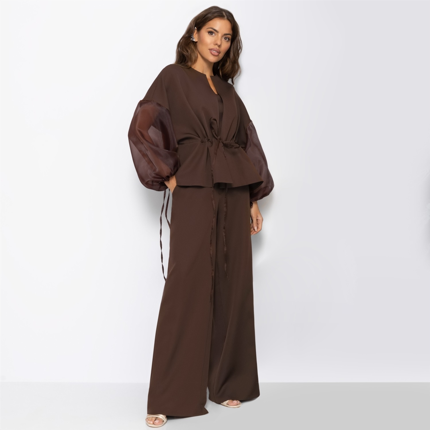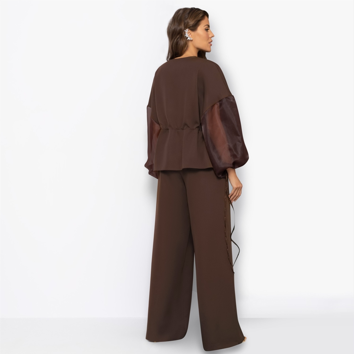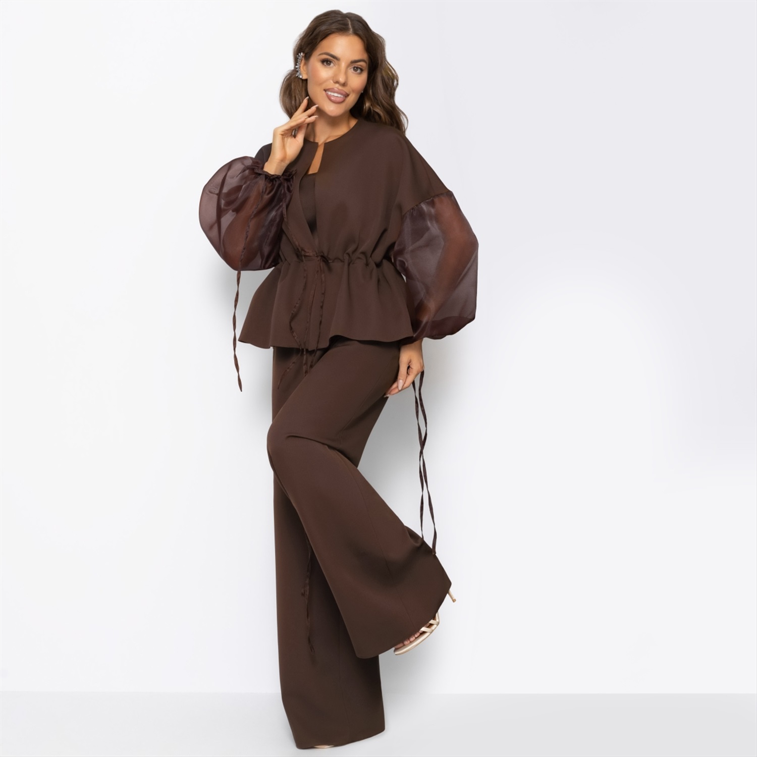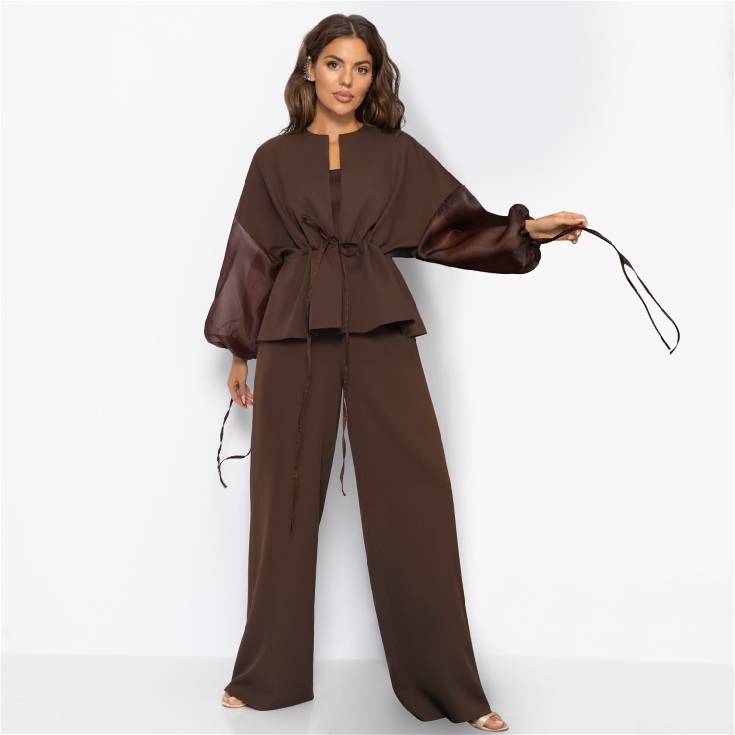 Утонуть, затеряться в этом тягучем, манящем, роскошно-шоколадном оттенке очень легко... Костюм ЧАРУТТИ идеален и для камерного вечера с бокалом вина, и для вечеринки в большом кругу коллег. Комплект состоит из расслабленного жакета и свободных прямых брюк. Легкий блеск подчеркивает благородство глубокого коричневого – тот самый оттенок брауни, в котором хочется раствориться. Регулируемая кулиска на талии позволяет варьировать посадку: стройное силуэт либо расслабленный оверсайз. Комментарии к товару