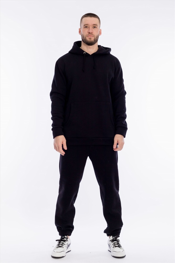 Цвет Номенклатуры: черный Брюки мужские из однотонного полотна с начёсом. В брюках два боковых кармана и притачной пояс на резине и шнуре. Низ брюк на резинке.