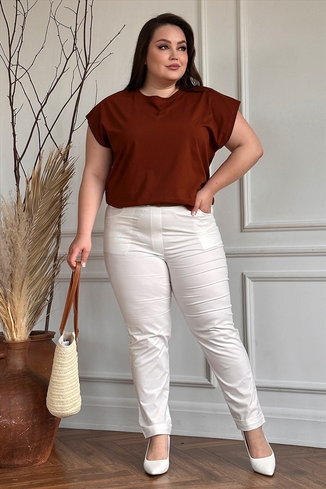 Брюки-стрейч отлично подойдут для повседневного гардероба. Модель хорошо сидит за счет комфортной резинки на поясе. Имеет втачные карманы по бокам и накладные карманы сзади, декорированные кнопками. Зауженные книзу брючины и вертикальные полосы визуально стройнят. Низ брючин оформлен отворотом. Эти модные брюки станут идеальным вариантом для стильного образа.
