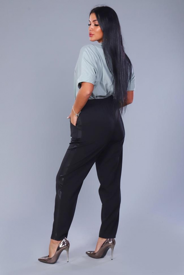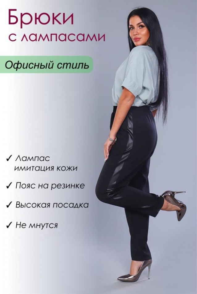Классические черные брюки с лампасами из ткани - имитации кожи. Брюки будут актуальны практически везде: работа, деловая встреча, прогулка, торжественный случай, смотря с каким верхом их комбинировать. Благодаря высокой посадке и широкому поясу на резинке, изделие хорошо сядет на любую фигуру. Брюки заужены книзу, по бокам внутренние карманы. Ширина лампаса - 3,5 см. В замерах объем талии соответствует длине пояса в растянутом виде.