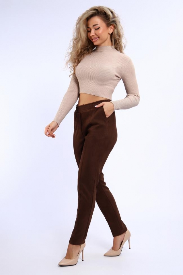 Удобные и практичные брюки из экозамши на все случаи жизни. Искуственая замша имеет приятную бархатистую поверхность, очень плотная, влагоустойчивая, хорошо тянется, проста в уходе. Брюки из этой ткани будут незаменимы в прохладное время года для прогулок и для офиса. Брюки прилегающего силуэта, средняя посадка, на передних половинках прострочены стрелки и обработана имитация гульфика. Удобный пояс на резинке, по бокам внутренние карманы. Брюки будут хорошо смотреться с обувью на каблуке и без каблука. Тем , кто желает более плотного прилегания по фигуре, советуем брать размер поменьше. В замерах обхват талии соответствует длине резинки в растянутом виде. Утюжить изделие лучше с изнанки или через ткань.