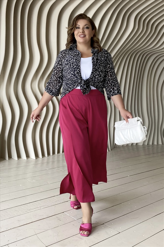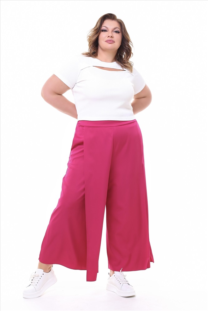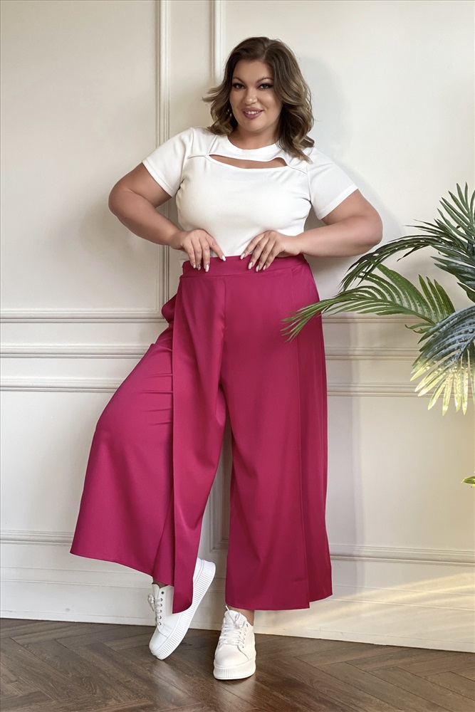 Оригинальные кюлоты свободного кроя из мягкого струящегося материала. Модель имеет завышенную линию талии. Брюки отлично сидят за счет резинки на задней части. Модель привлекает внимание широким клешем. Декоративные запАхи по переду и разрезы по бокам на брючинах способствуют оптимальной посадке по фигуре. Вшивные карманы добавляют практичности. Подходят такие вещи представительницам прекрасного пола с разными типами фигуры. Прекрасно подойдут для комбинирования с водолазками, свитерами, блузками и рубашками. Эти модные брюки станут идеальным вариантом для создания стильного образа.