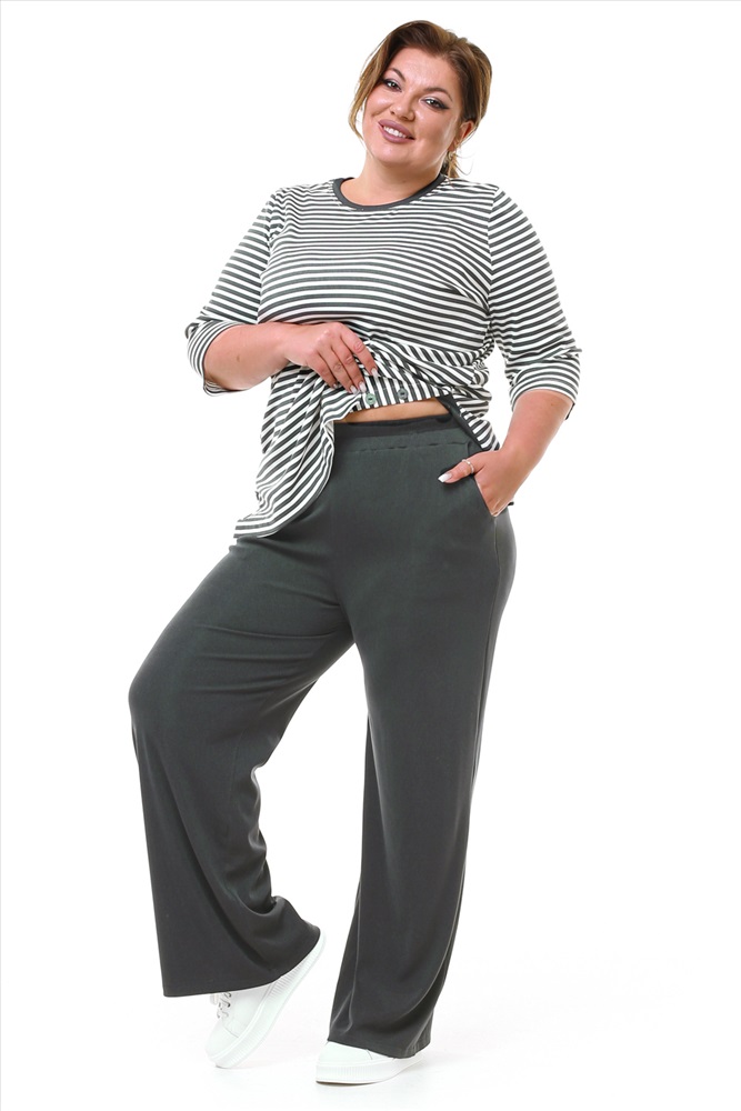 Брюки из мягкого трикотажа. Имеют завышенную линию талии. Брюки отлично сидят за счет комфортной резинки на поясе. По бокам практичные вшивные карманы. Мягкий материал обеспечивает комфорт на весь день, а свободный силуэт искусно обыгрывает фигуру и не сковывает движений. Подходят такие вещи представительницам прекрасного пола с разными типами фигуры. Модель замечательно подходит для свободного повседневного образа в спортивном стиле с кроссовками.