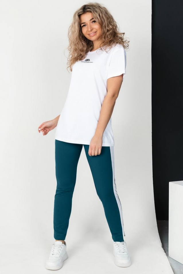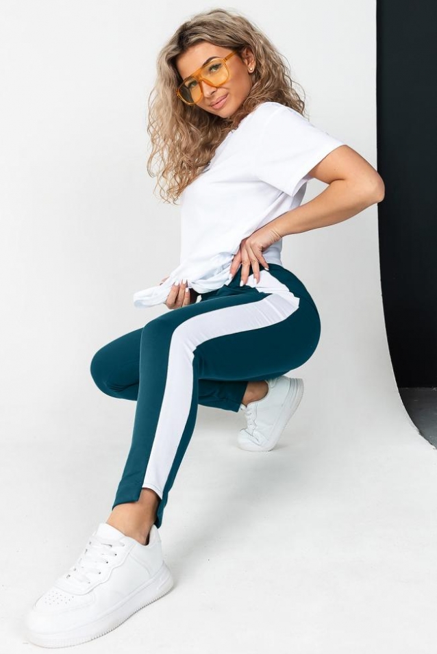 Брюки женские , плотно облегающие фигуру длиной до щиколотки, с боковыми внутренними карманами. Боковые вставка-лампасы укорочены, что создает оригинальный фасон брюк. Лампас контрастного цвета, что зрительно вытягивает фигуру.