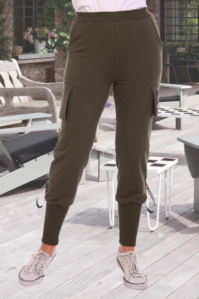 Спортивные брюки, полуприлегающего силуэта на эластичном поясе,низ брюк на широких притачных манжетах. по боковым швам расположенны накладные карманы и декоративная лента.
