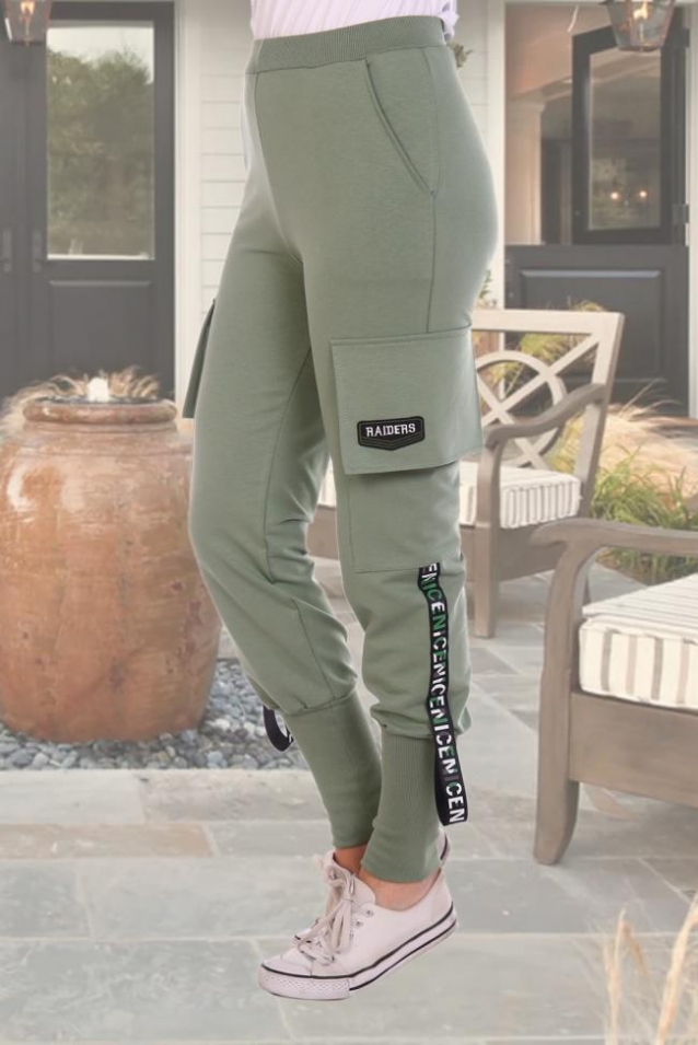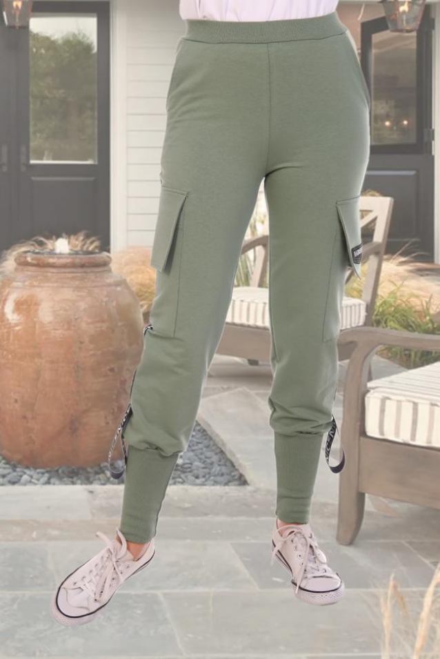 Спортивные брюки, полуприлегающего силуэта на эластичном поясе,низ брюк на широких притачных манжетах. по боковым швам расположенны накладные карманы и декоративная лента.