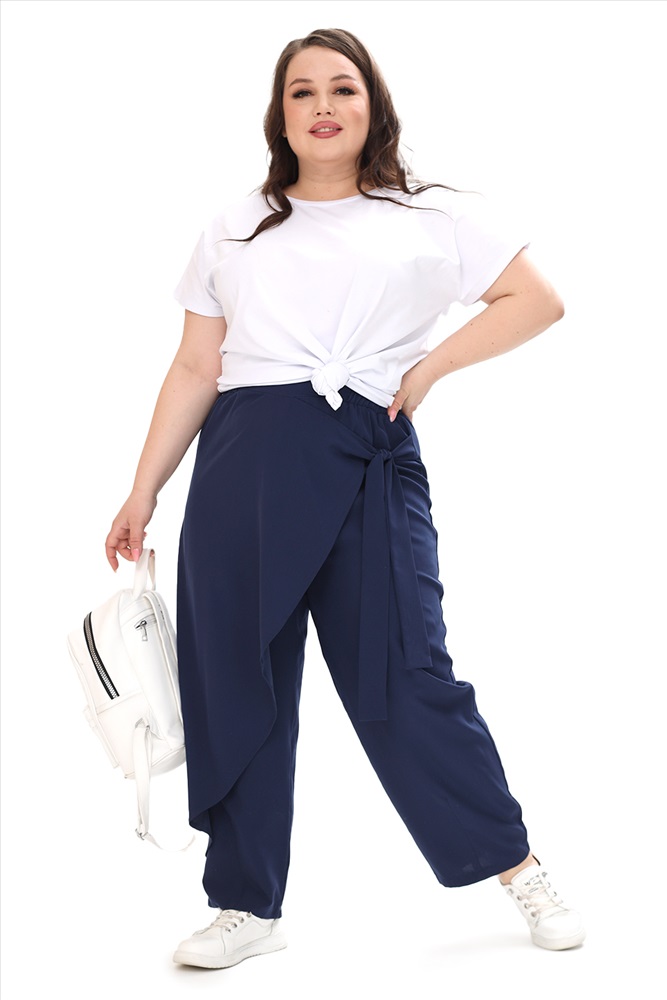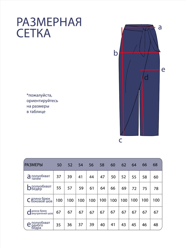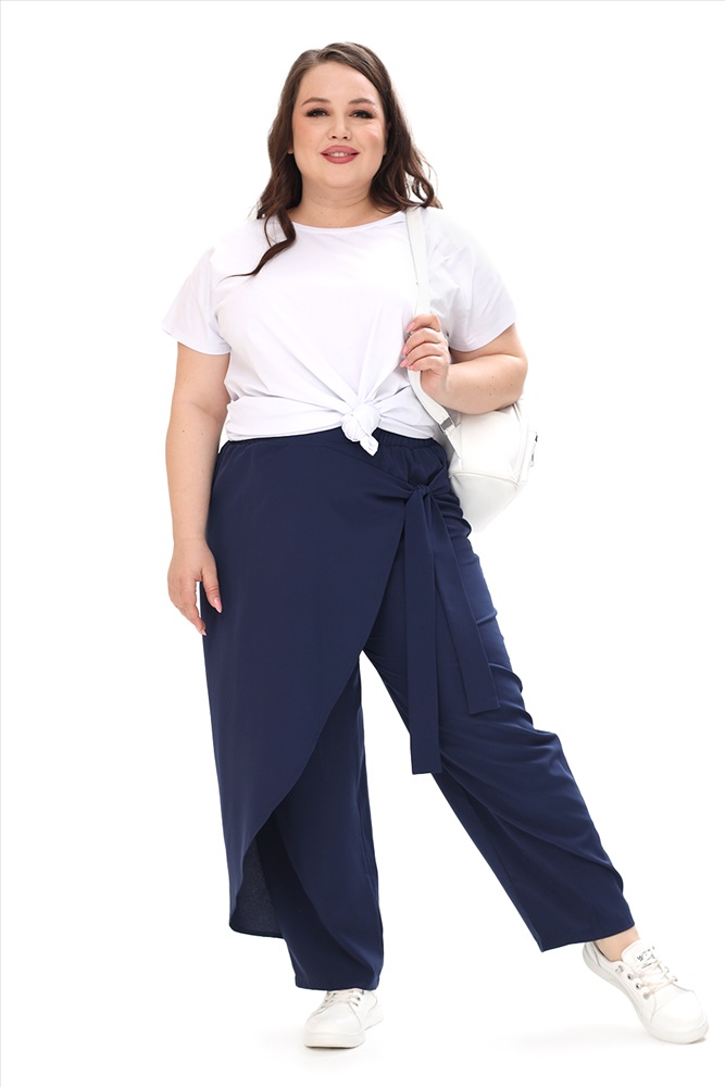 Лаконичные брюки из мягкого эластичного материала. Высокая посадка и комфортная резинка на поясе обеспечивают оптимальную посадку по фигуре. Оригинальный асимметричный запАх спереди собирается сбоку с помощью завязки. Брюки подчеркивают женственные формы и скрывают недостатки фигуры. Модель прекрасно подойдёт для комбинирования с блузками, рубашками, топами и жакетами. Эти модные брюки станут идеальным вариантом для создания стильного образа.