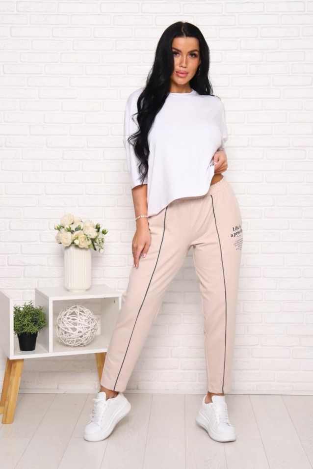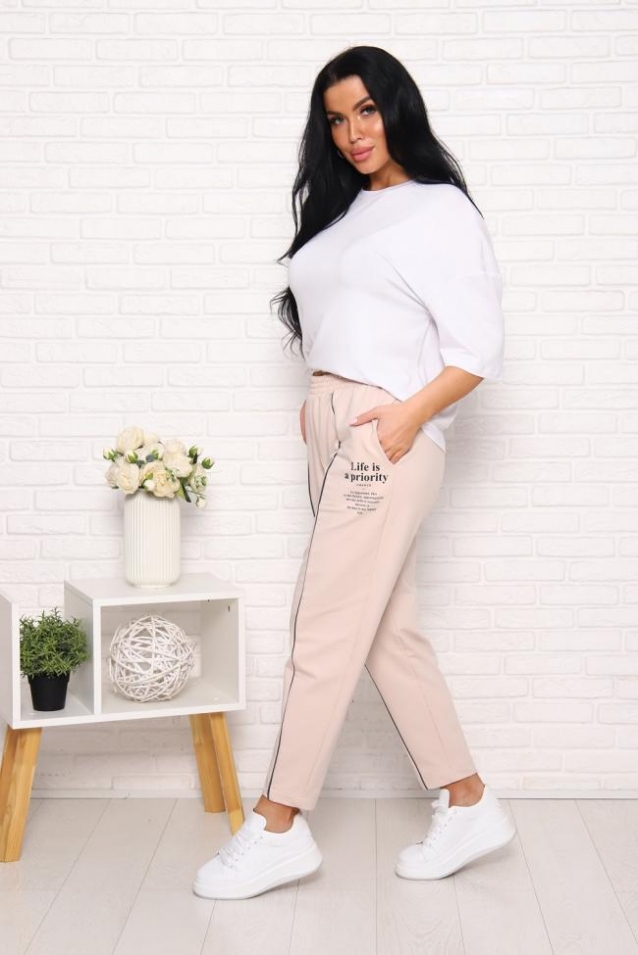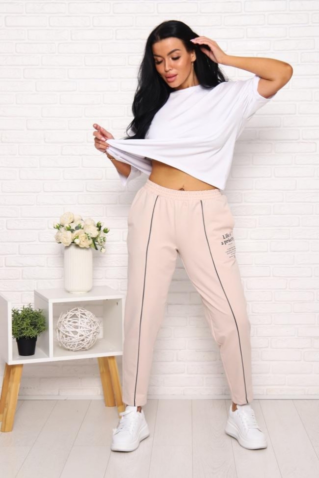 Брюки женские стильные, с боковыми карманами, с кантом в шве брюк и принтом спереди около кармана, эластичный комфортный пояс.