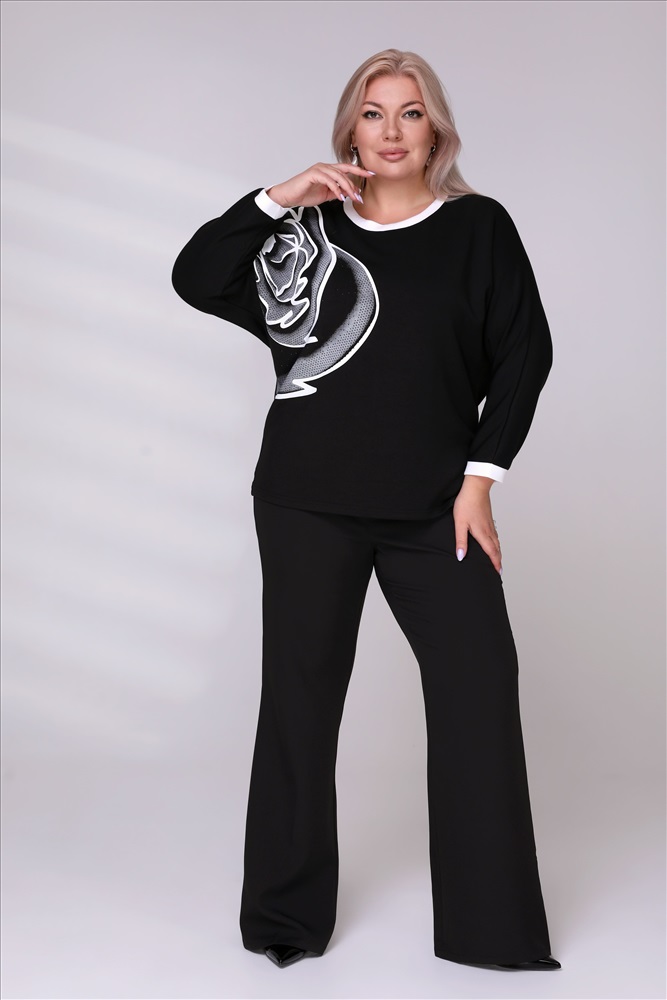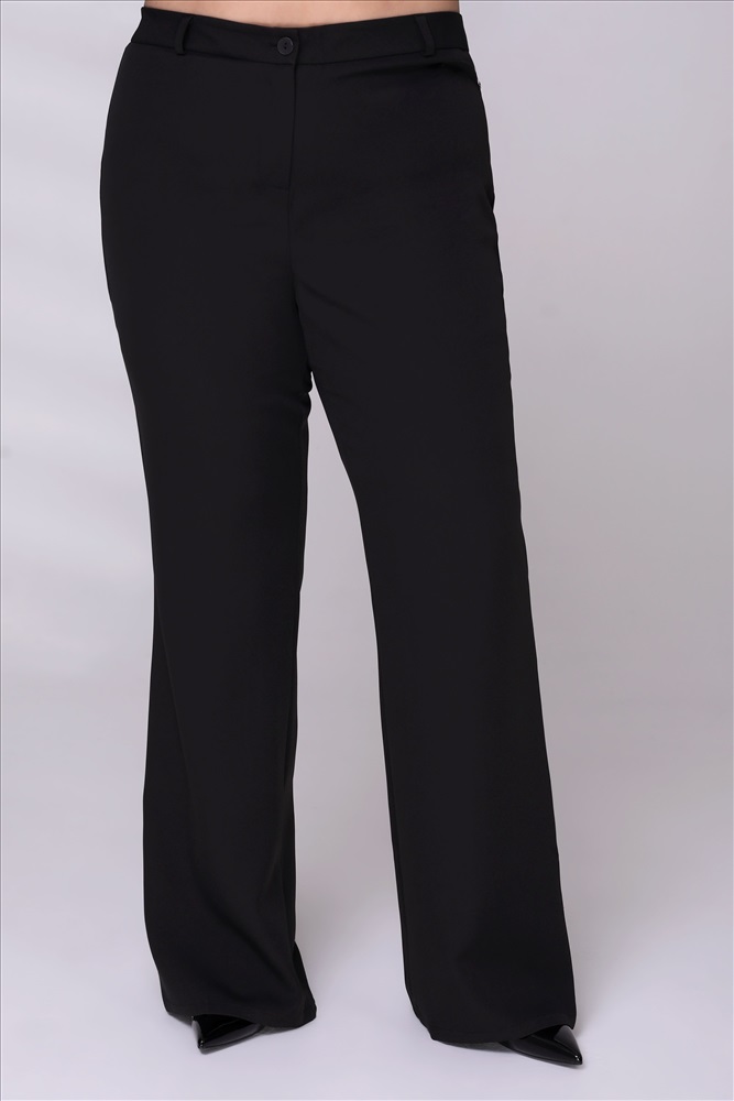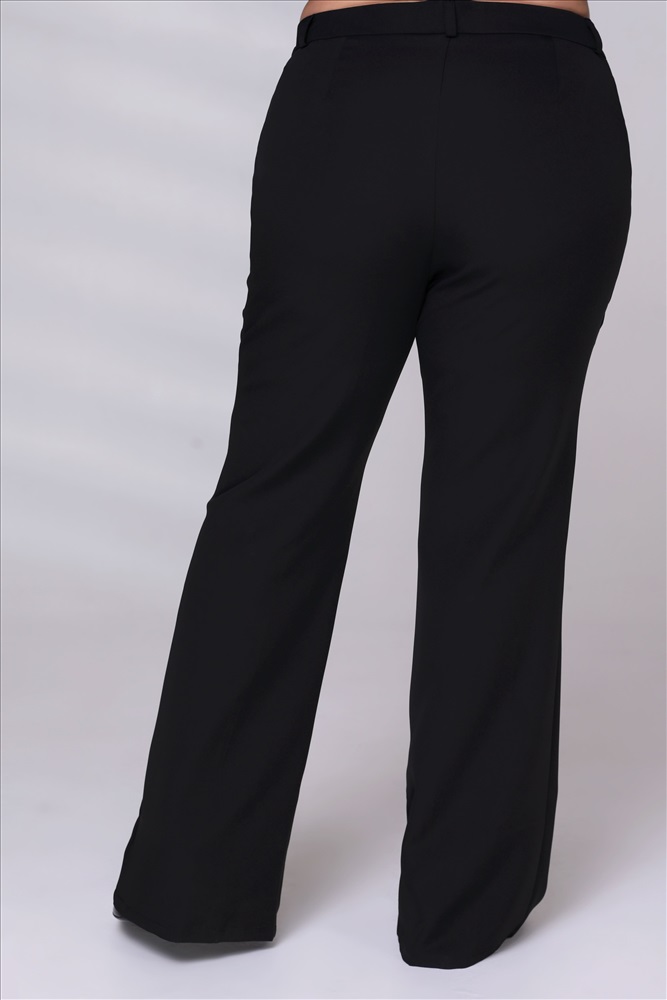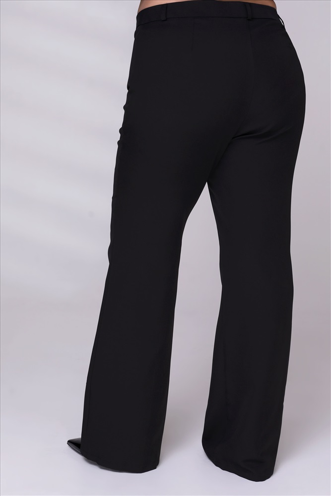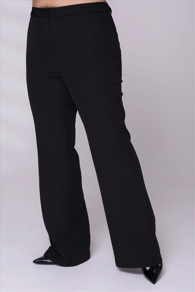Брюки классического кроя отлично сидят за счет притачного пояса со шлевками. Модель привлекает внимание широким клешем книзу. Брюки застёгиваются спереди на скрытую молнию и пуговицу. Модель прекрасно подойдёт для комбинирования с водолазками, свитерами, блузками и рубашками. Эти модные брюки станут идеальным вариантом для создания стильного образа.