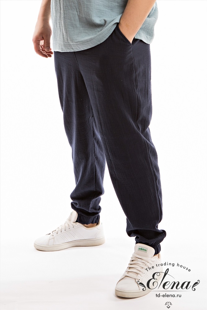 Вид ткани: Муслин Сезон: Летний Силуэт: Свободный Состав: Хлопок 100% Цвет Номенклатуры: синий Мужские брюки выполнены из хлопкового полотна - муслина. Пояс притачной на резине и шнуре, по бокам размещены карманы. Низ брюк собран на резинку. Комментарии к товару