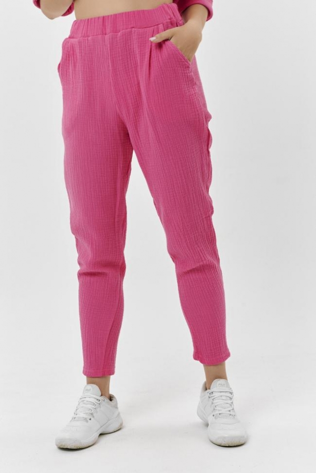Брюки свободные, на поясе, с боковыми карманами. В верхней части передних половинок по шву притачивания пояса расположены складки.