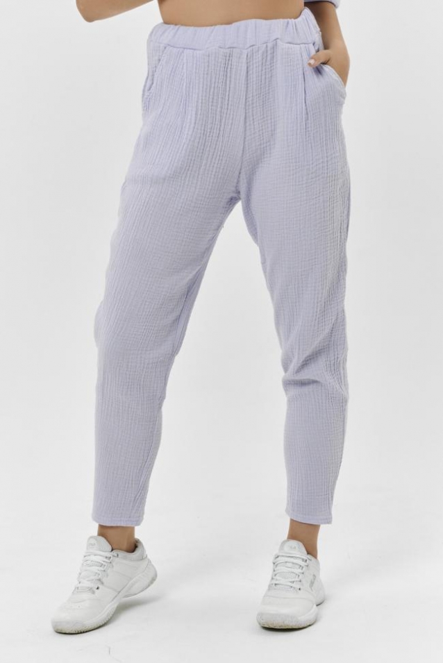 Брюки свободные, на поясе, с боковыми карманами. В верхней части передних половинок по шву притачивания пояса расположены складки.