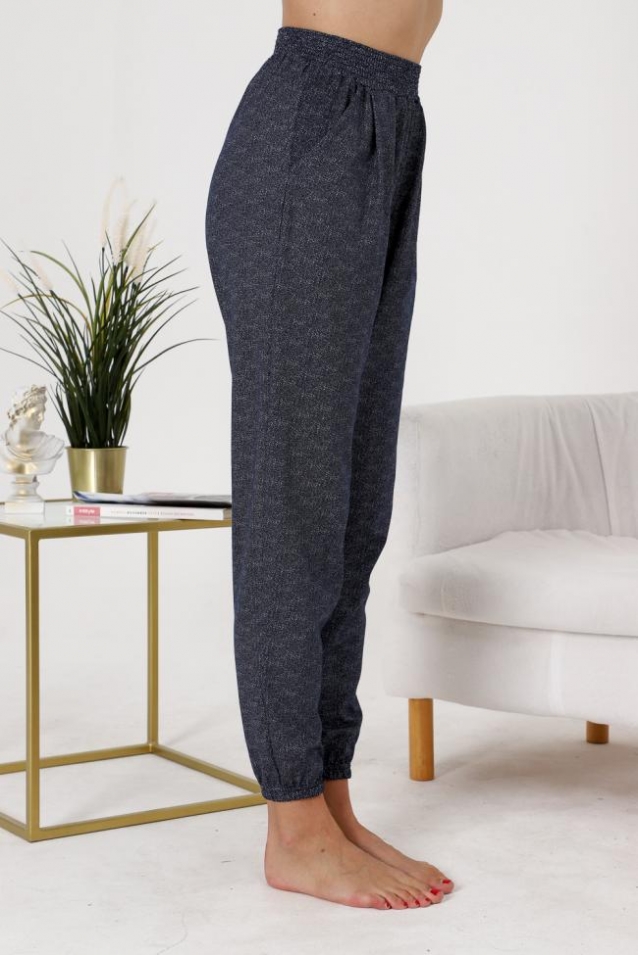 Брюки свободные, на поясе, с боковыми карманами. В верхней части передних половинок, по шву притачивания пояса, расположены складки. Низ брюк собран на резинку.