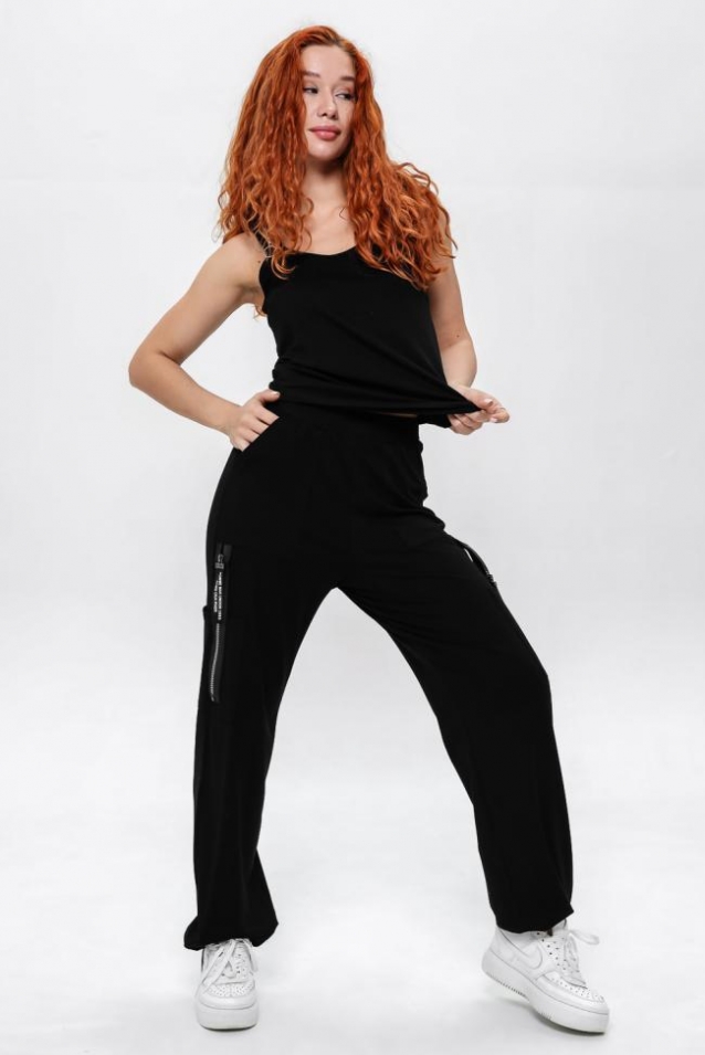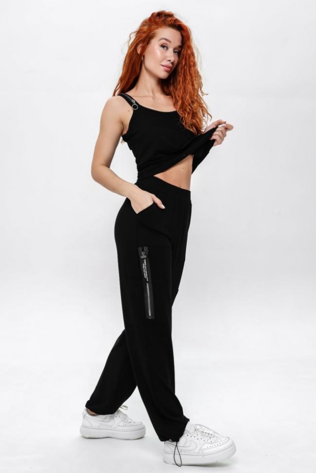 Брюки-джогеры прямые, на поясе, с карманами вверху, с накладными карманами и молниями по боковым швам. Низ брюк собран на резинку.