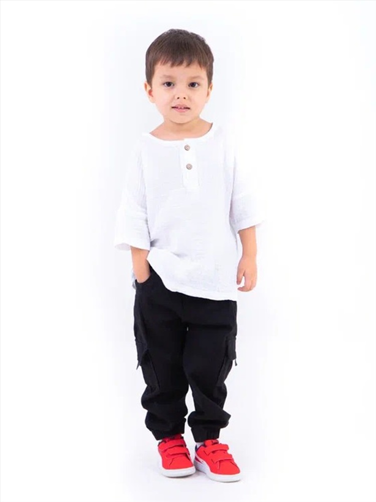 Классные джинсовые брюки для мальчика однотонного цвета. На поясе удобная широкая резинка с завязками, по низу изделия также имеются резинки. По бокам расположены два внутренних кармана и два пришивных, сзади - два накладных кармана. Материал изделия - габардин.