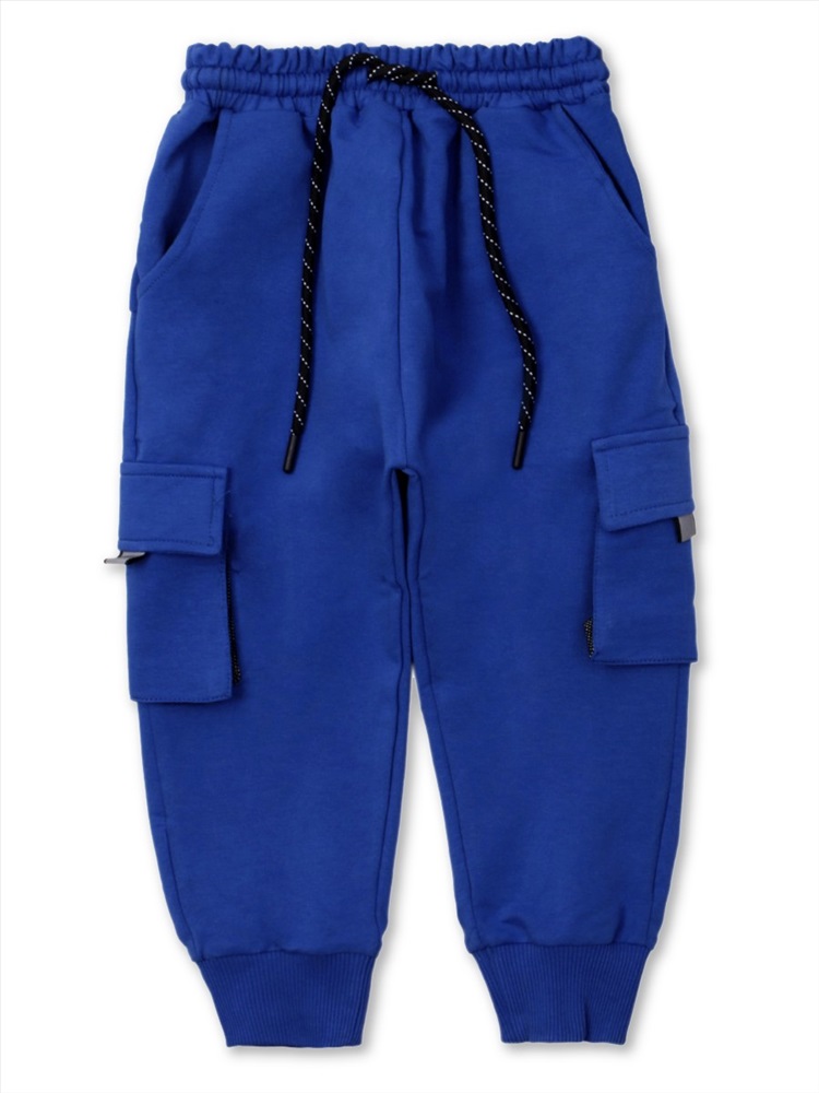 Классные брюки для мальчика, изготовленные из плотного материала - футера 2-нитки. На поясе удобная широкая резинка с завязками, по бокам два внутренних кармана и два накладных кармана. По низу изделия имеются мягкие трикотажные манжеты. Модель украшает стильный принт на нашивке в задней части штанов.