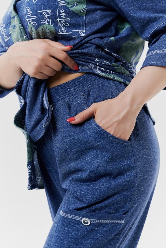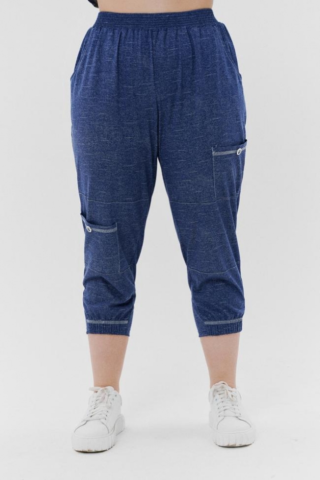 Брюки женские, бананы. На передней части брюк внутренние карманы. Также имеются два накладных кармана с пуговицей, Один в верхней части брюк, другой на средней части брюк. Низ передней половинки брюк на резинке. Пояс прострочен на многоигольной машине.