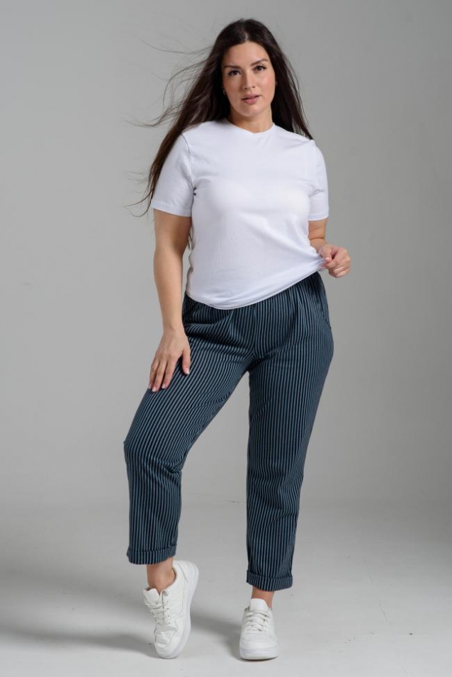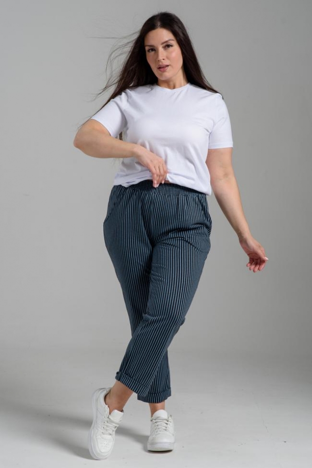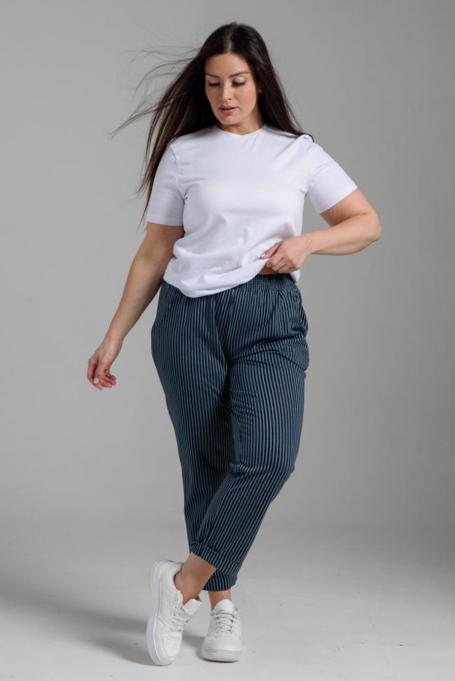 Брюки женские, полуприлегающие, длина 7/8, пояс выполнен на многоигольной машине. На передних половинках брюк внутренние карманы. Внизу брюк цельнокроеные манжеты.