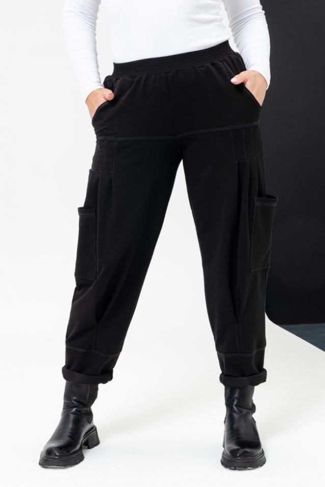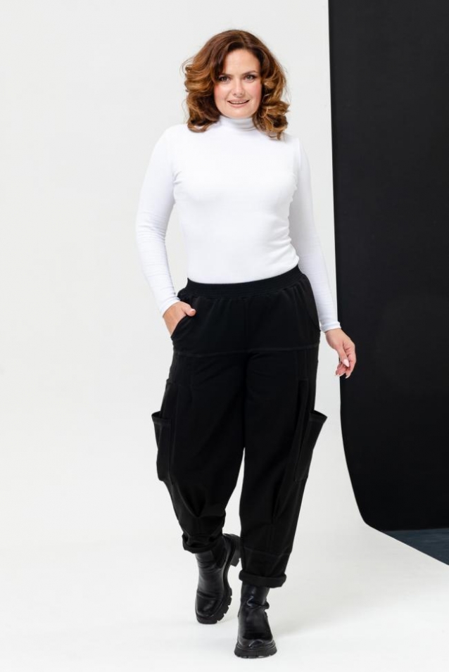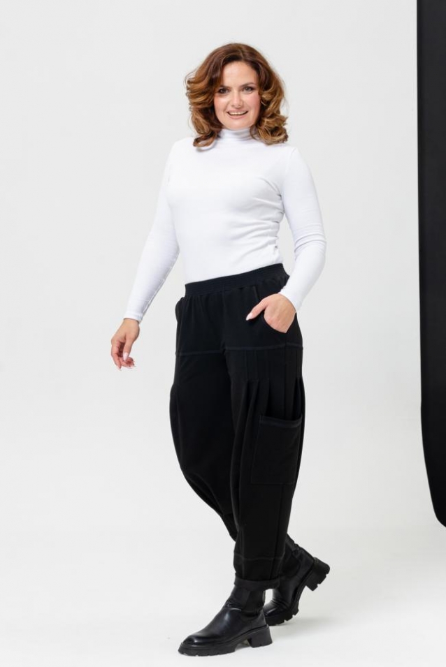 Брюки женские, бананы. Передние и задние части брюк из трех частей. В верхней передней части брюк внутренние карманы. В средней части брюк по три вертикальные складки и по-боковому накладные карманы. Конструкция брюк позволяет скрыть любые недостатки в области бедер.