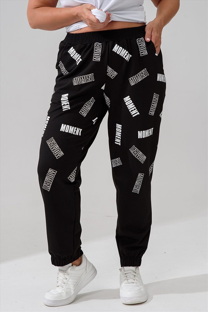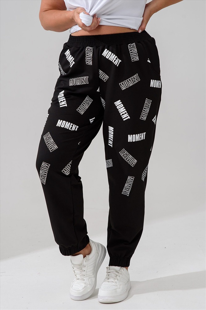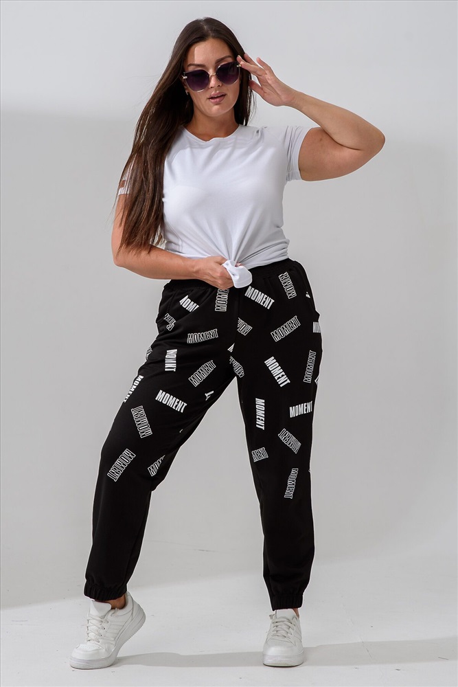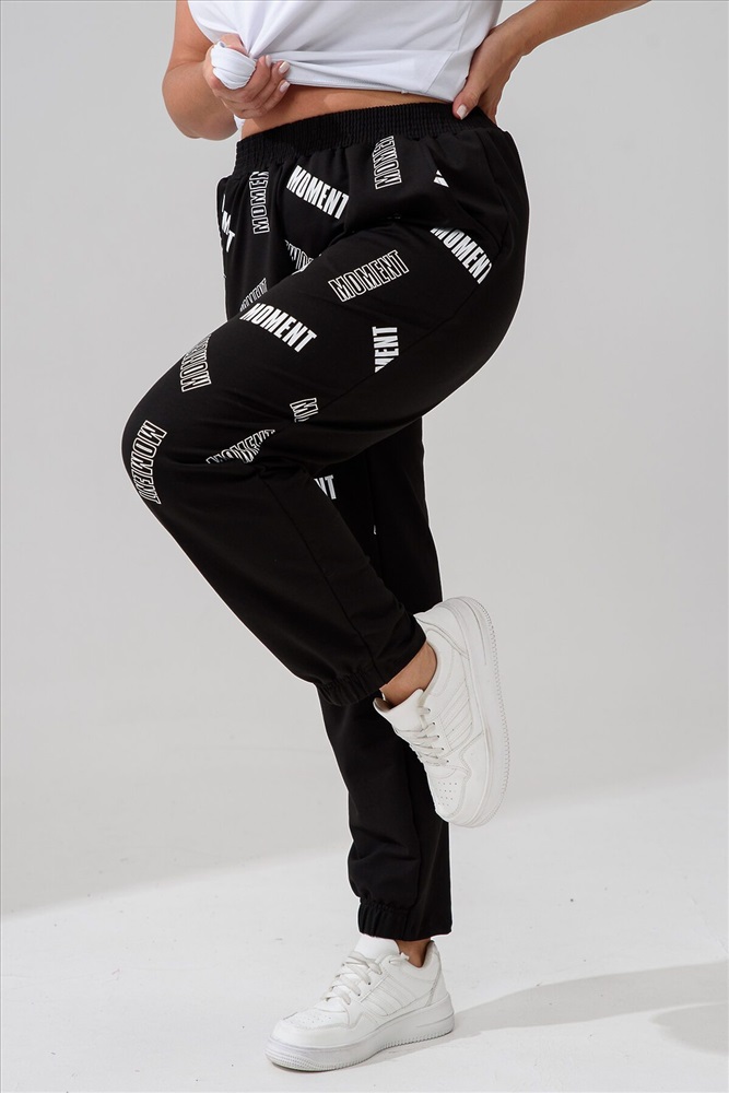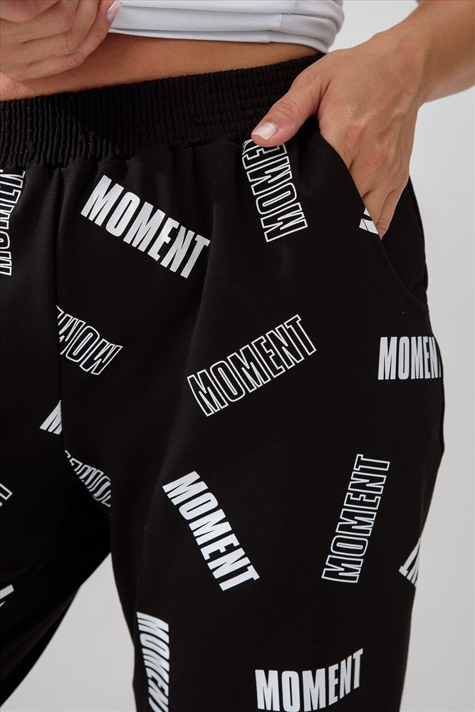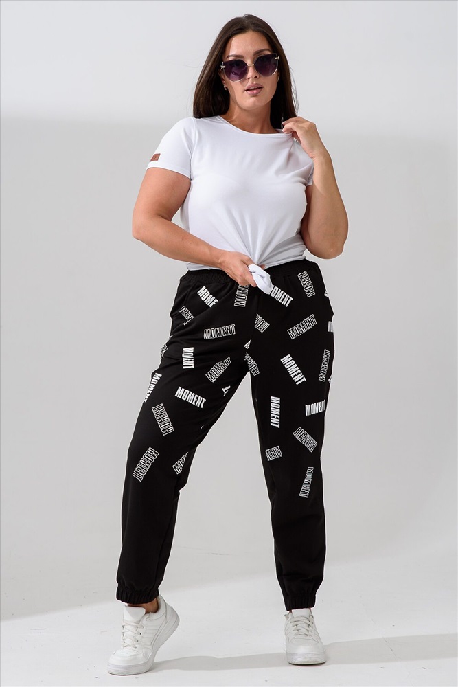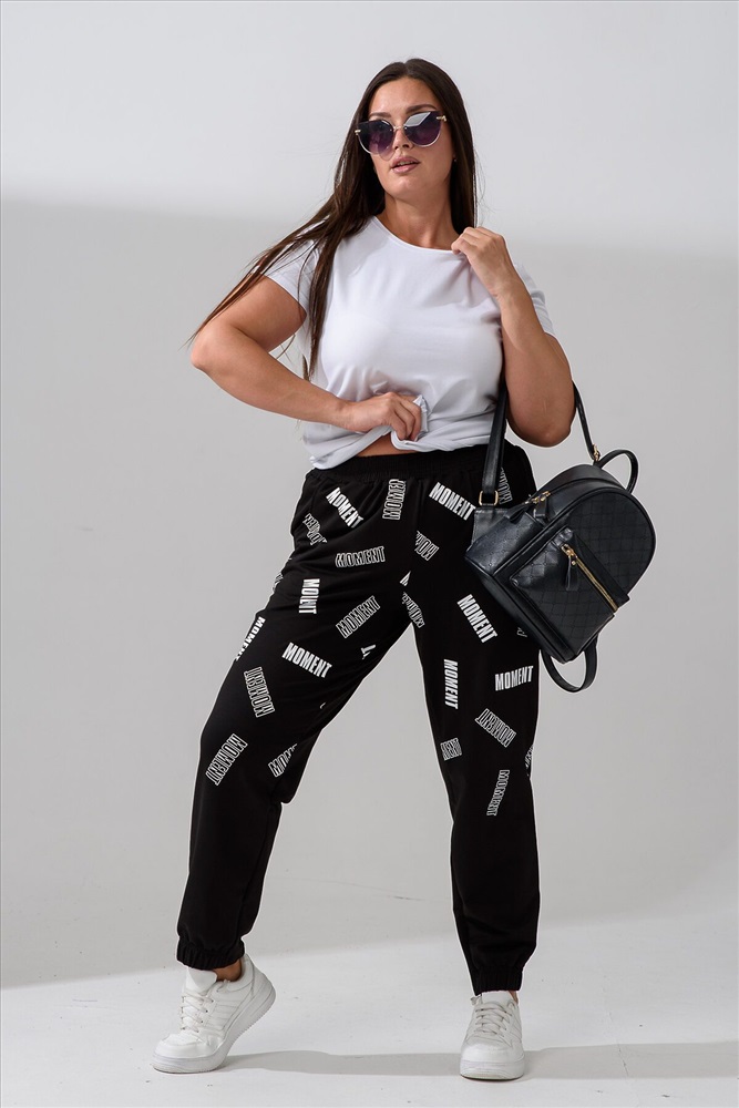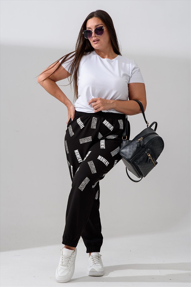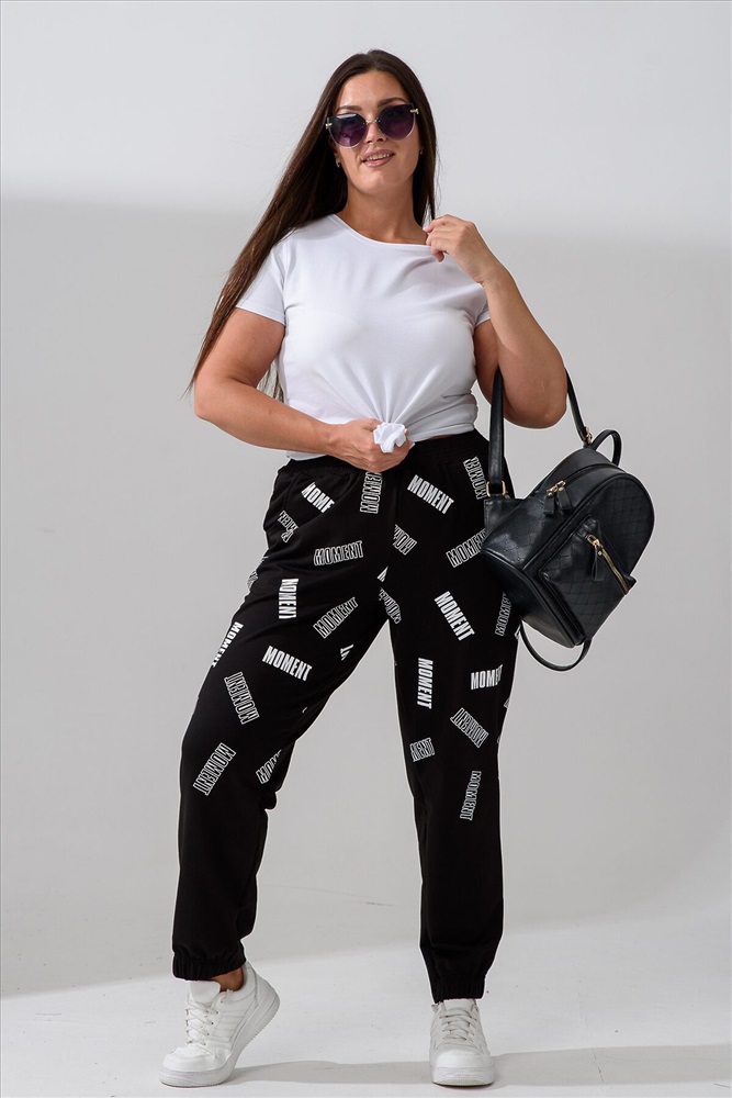 Брюки женские, свободные по бедрам, зауженные к низу. Спереди внутренние карманы, низ передней части брюк собран на эластичную ленту. Пояс выполнен на многоигольной машине. На передней и задней частях брюк принт. Идеальны для повседневной носки.