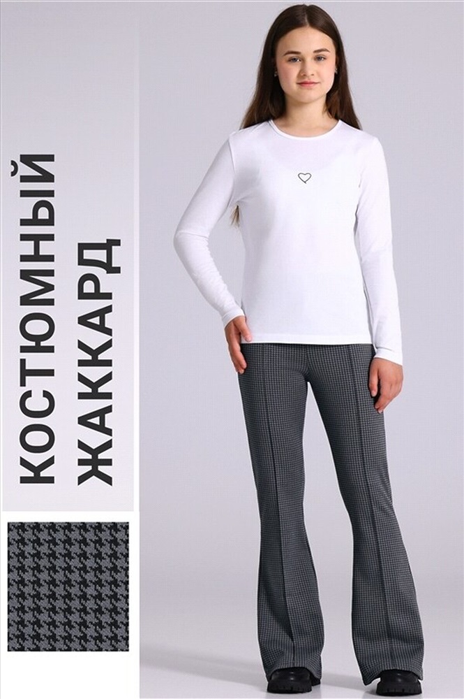 Школьные брюки-клеш для девочки выполнены из плотного полотна с рельефным рисунком, выполненным с применением жаккардового плетения. Изделие со средней высотой посадки, без карманов, декорировано острочками-стрелками. Уход: только машинная стирка (руками не стирать!) при температуре 40 градусов, без предварительного замачивания.