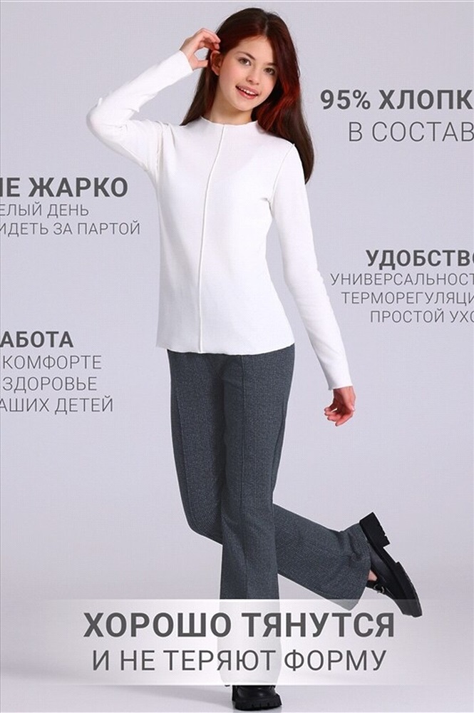 Школьные брюки-клеш для девочки выполнены из футера – мягкого плотного хлопкового полотна с лайкрой. Изделие со средней высотой посадки, без карманов, декорировано острочками-стрелками. Уход: только машинная стирка (руками не стирать!) при температуре 40 градусов, без предварительного замачивания.
